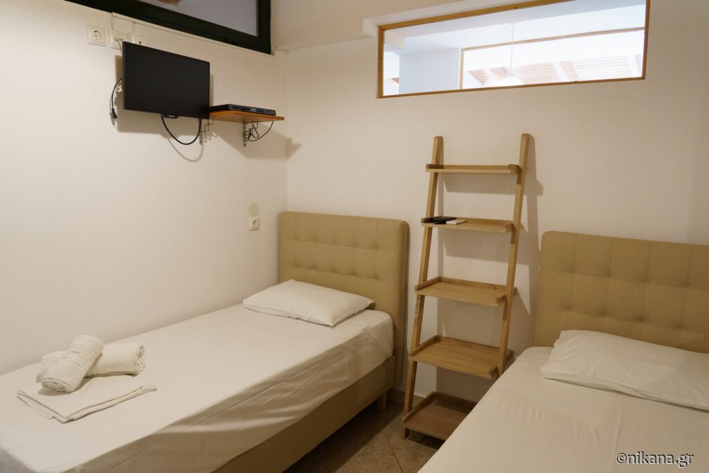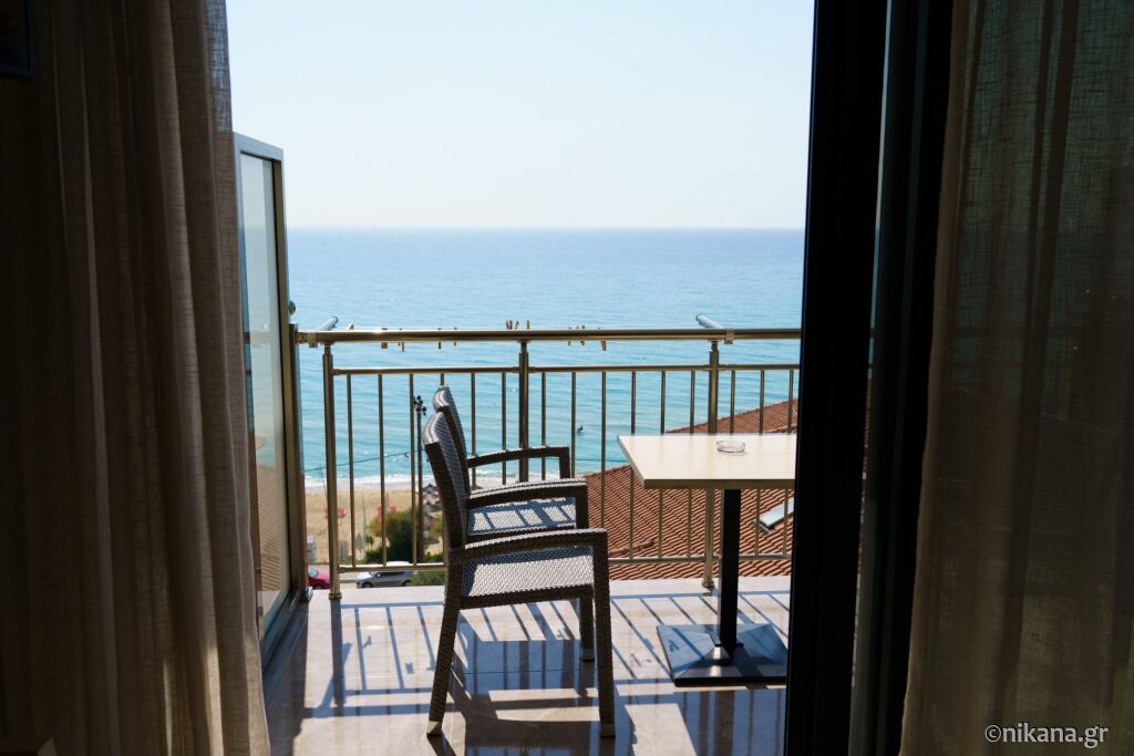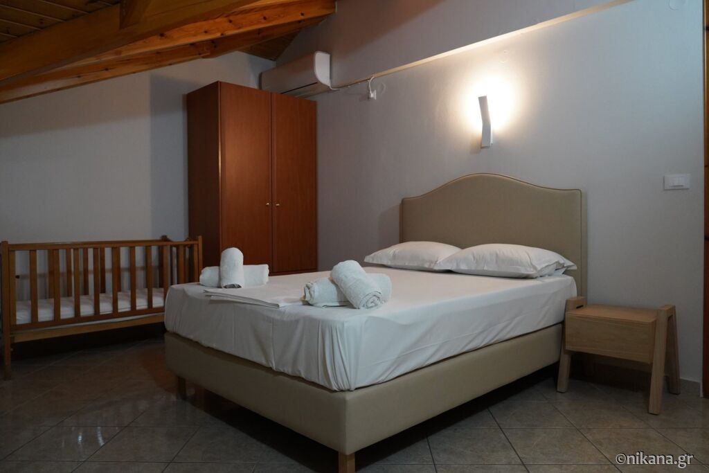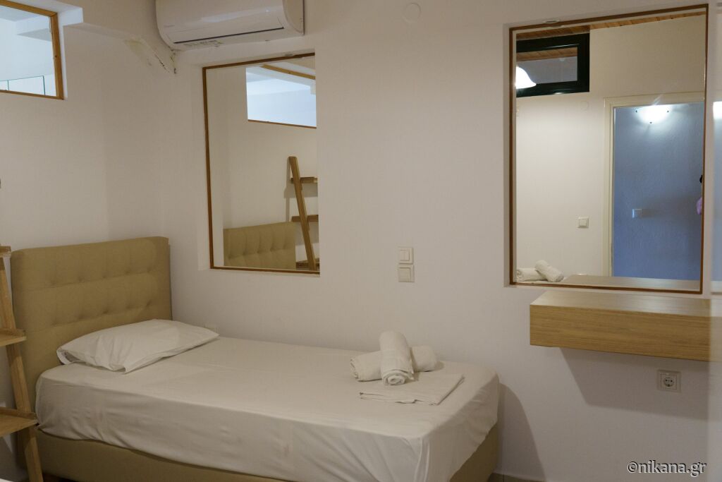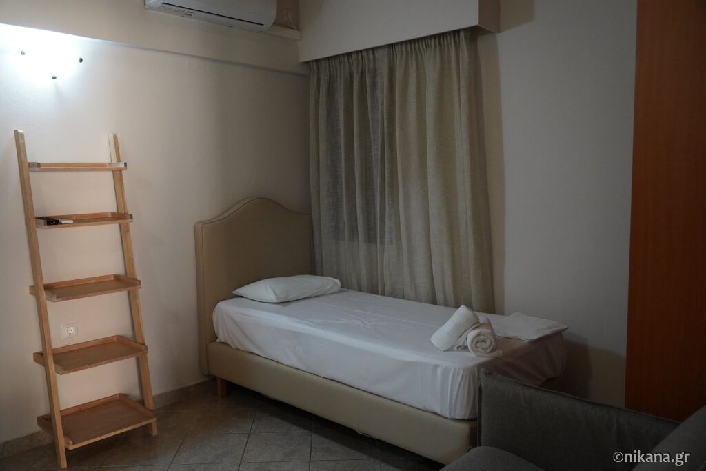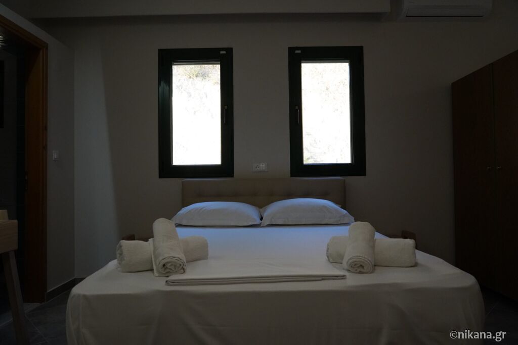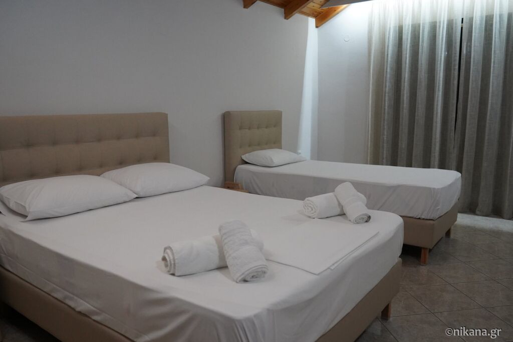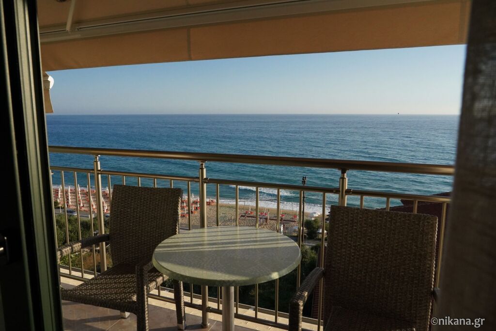 There are also five apartments (45-50m2) with one double bed in one bedroom and two single beds in the other room. Two apartments (no. 4 and 5) have a side sea view (no. 5 has one bedroom, not two), the others have a direct view.