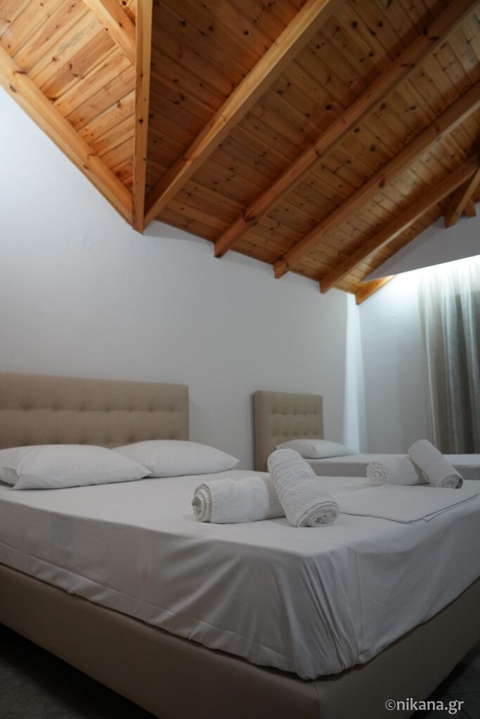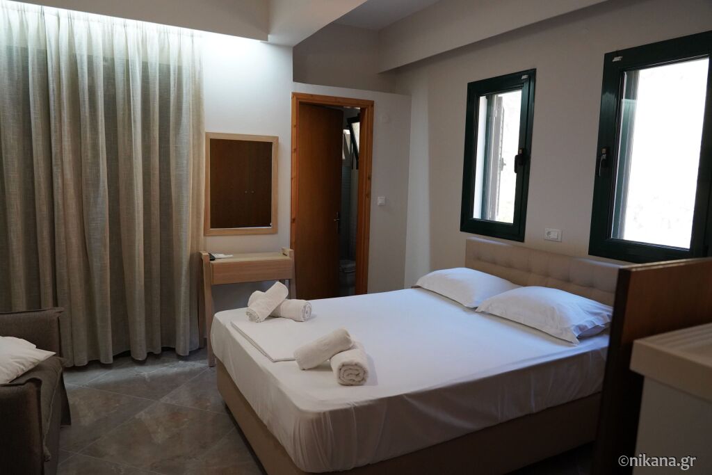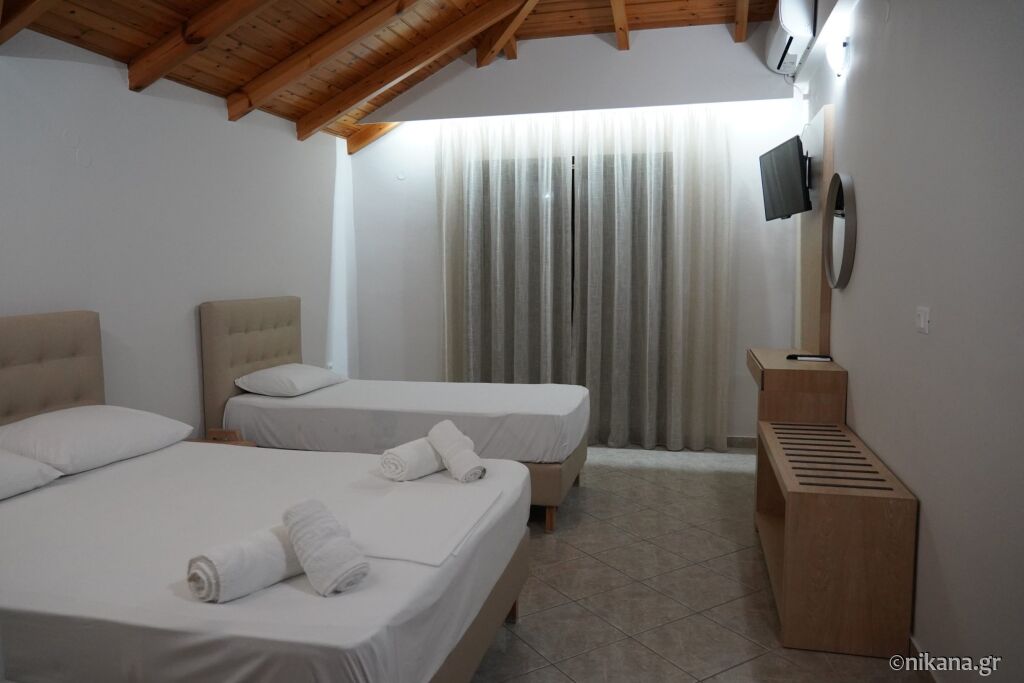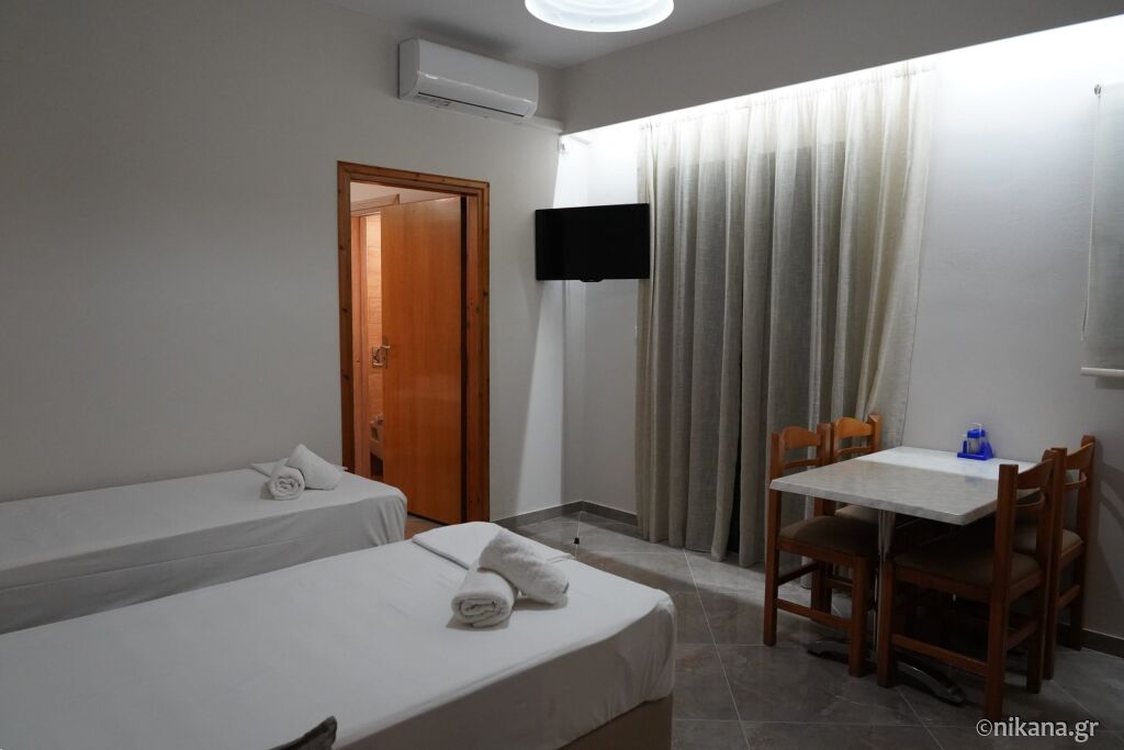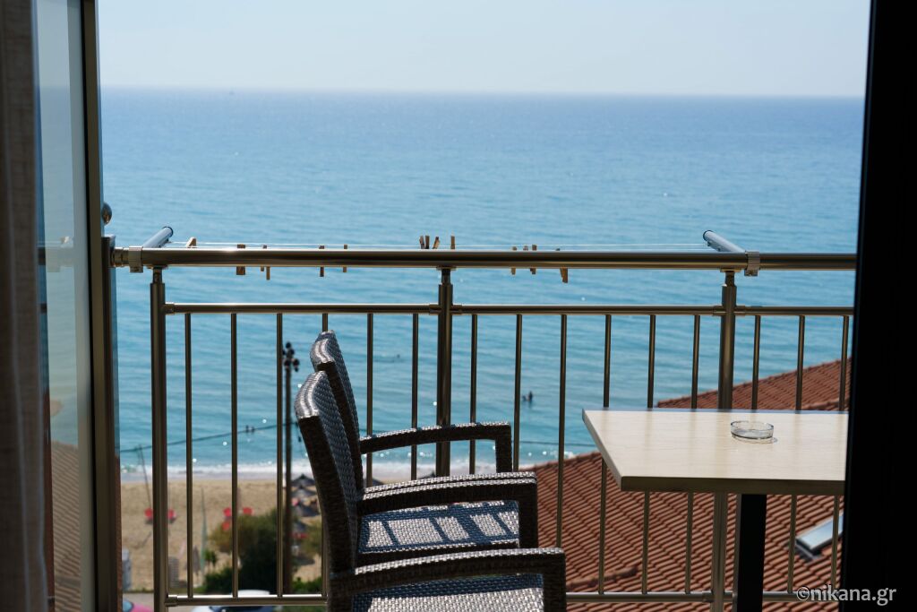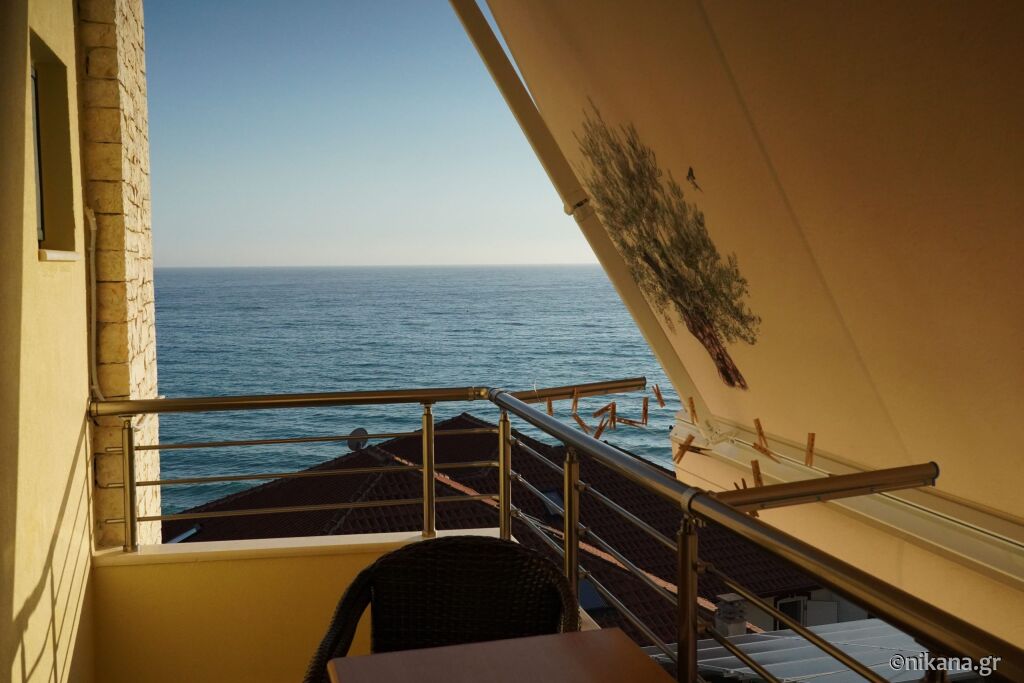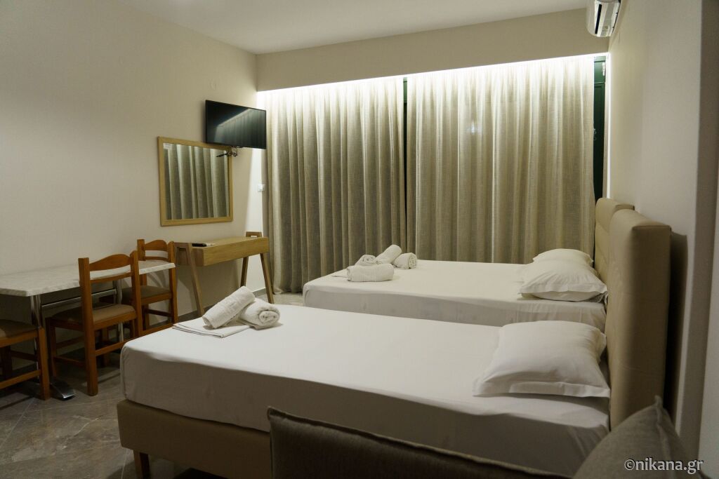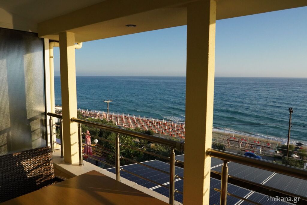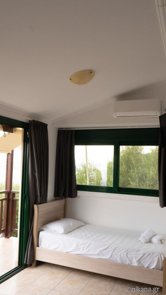 There are also five apartments (45-50m2) with one double bed in one bedroom and two single beds in the other room. Two apartments (no. 4 and 5) have a side sea view (no. 5 has one bedroom, not two), the others have a direct view.