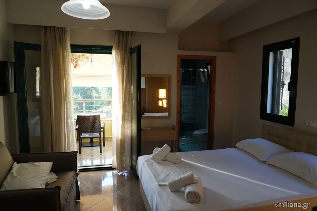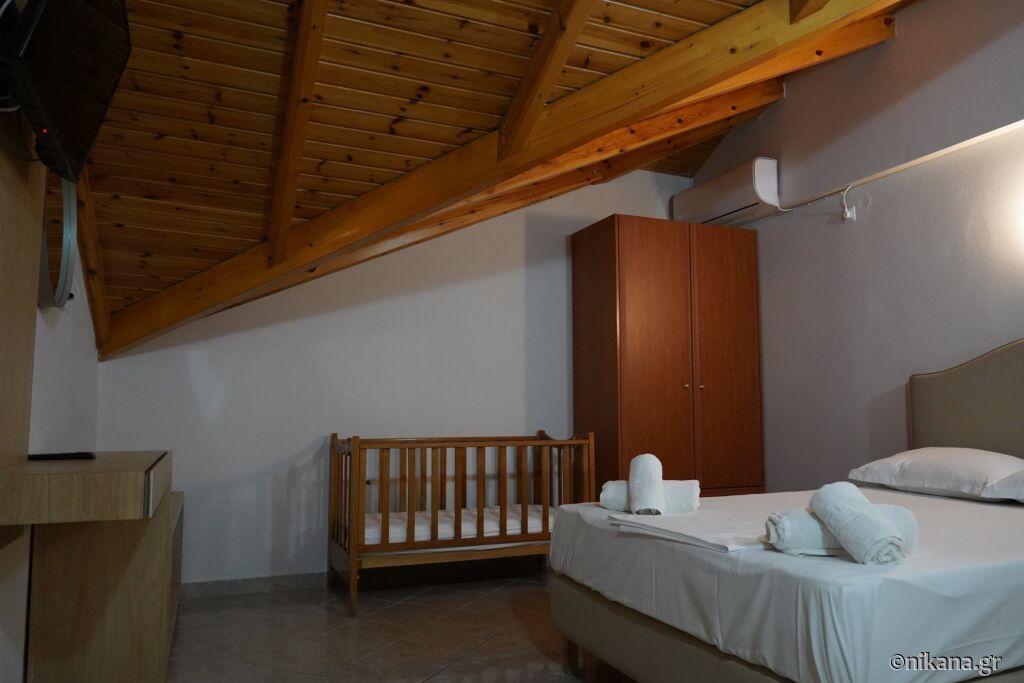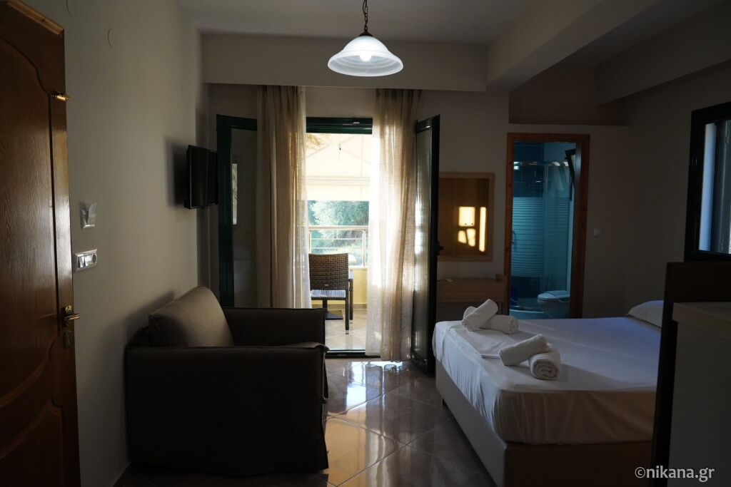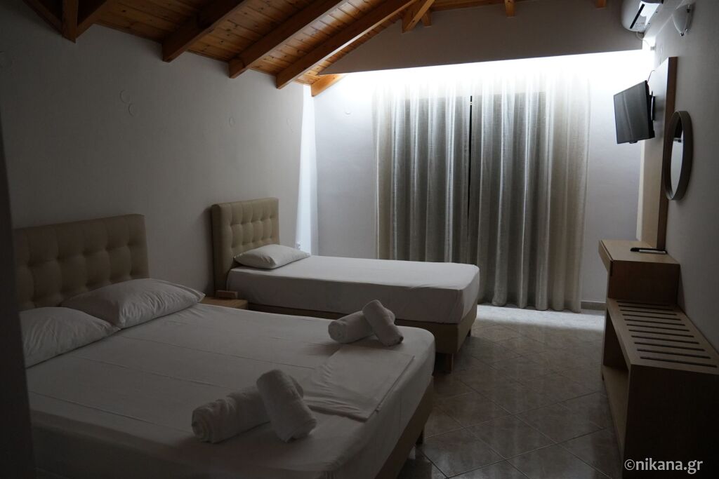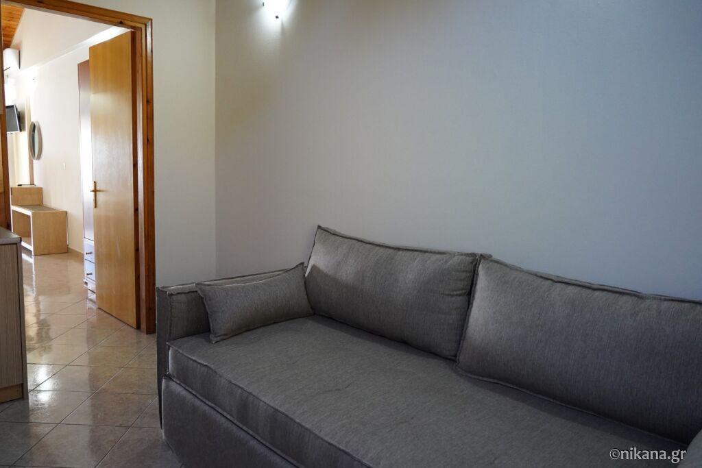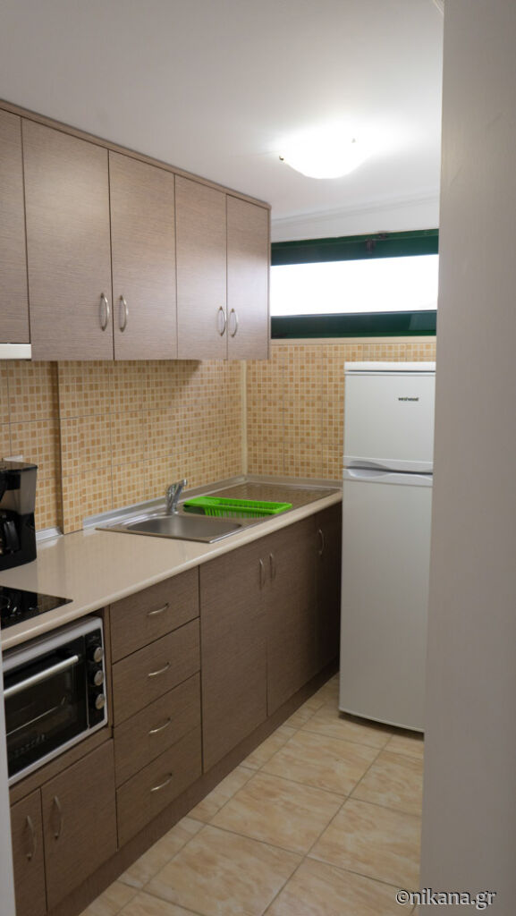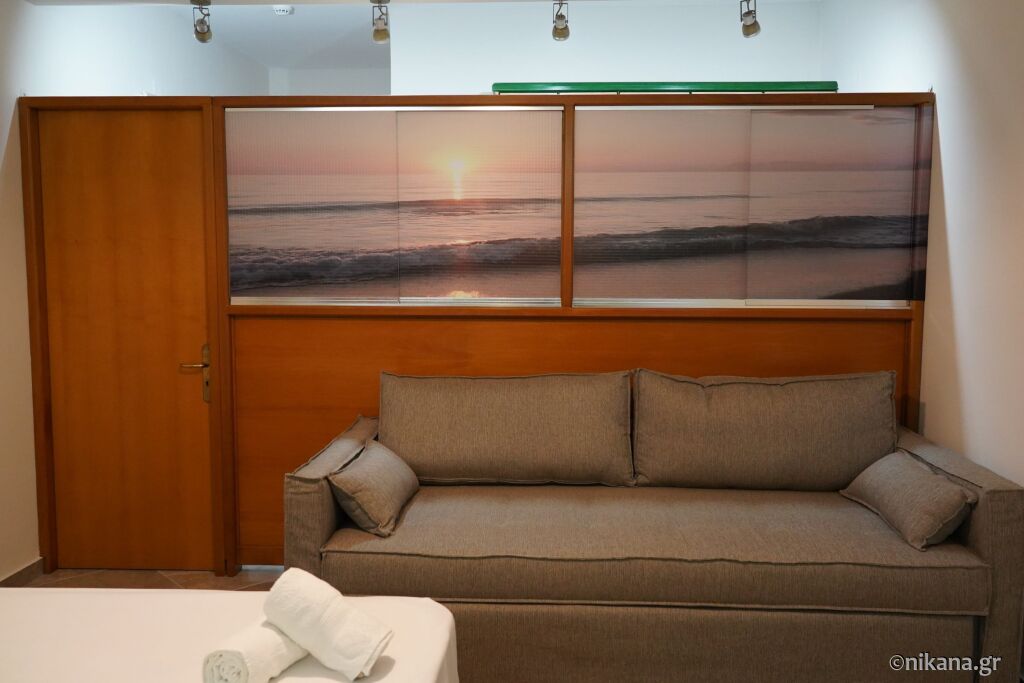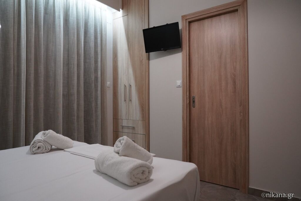 There are also five apartments (45-50m2) with one double bed in one bedroom and two single beds in the other room. Two apartments (no. 4 and 5) have a side sea view (no. 5 has one bedroom, not two), the others have a direct view.