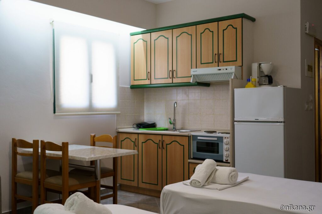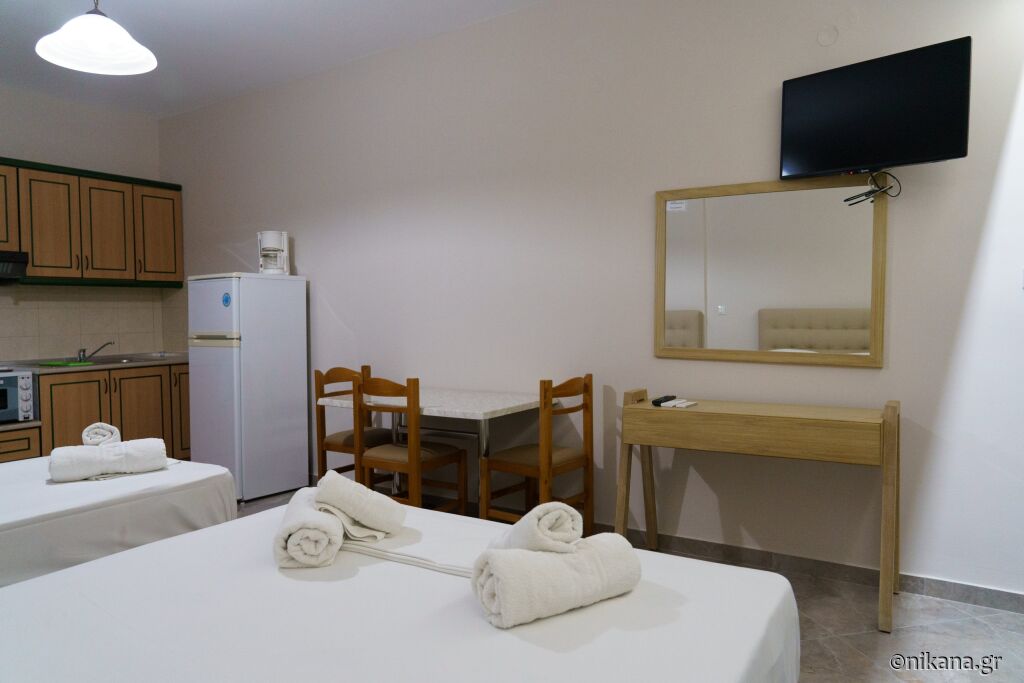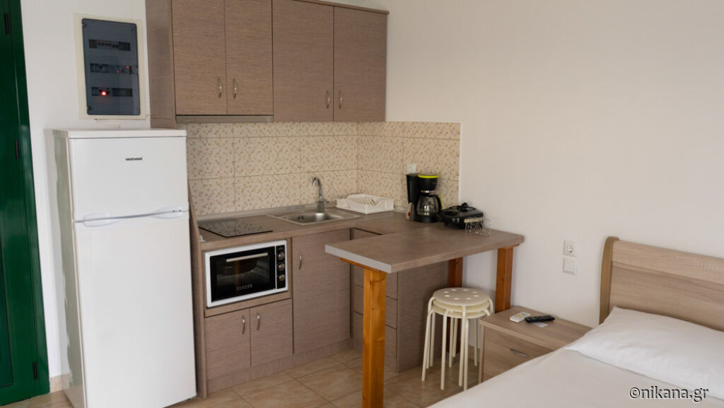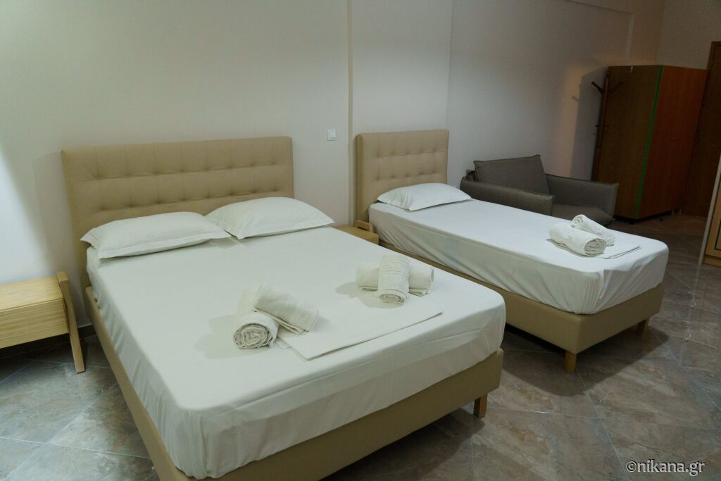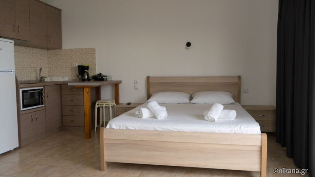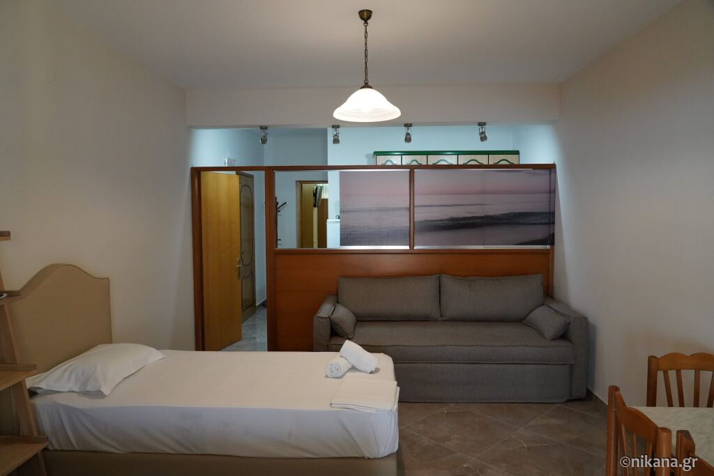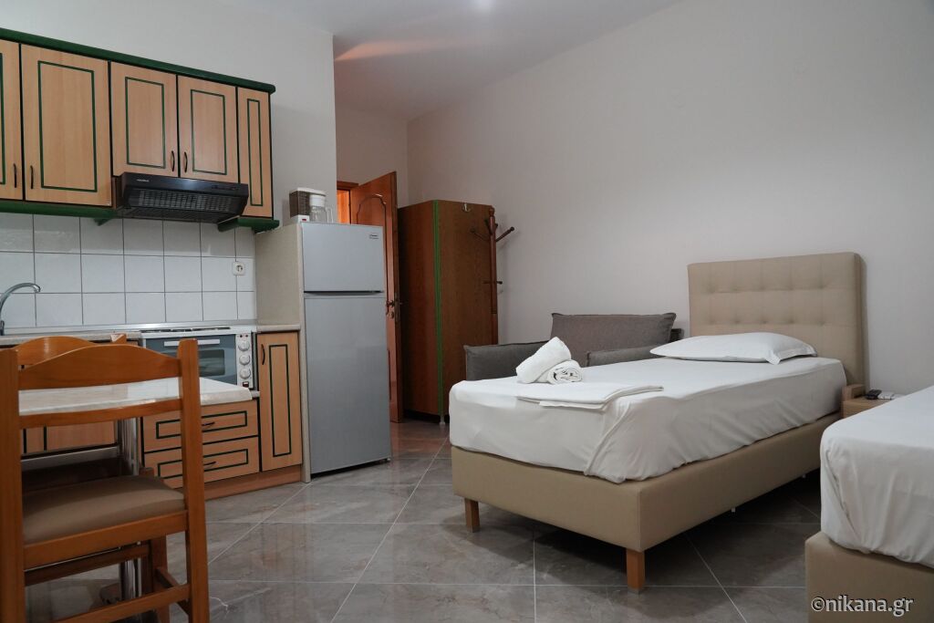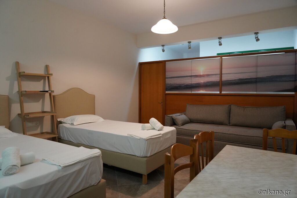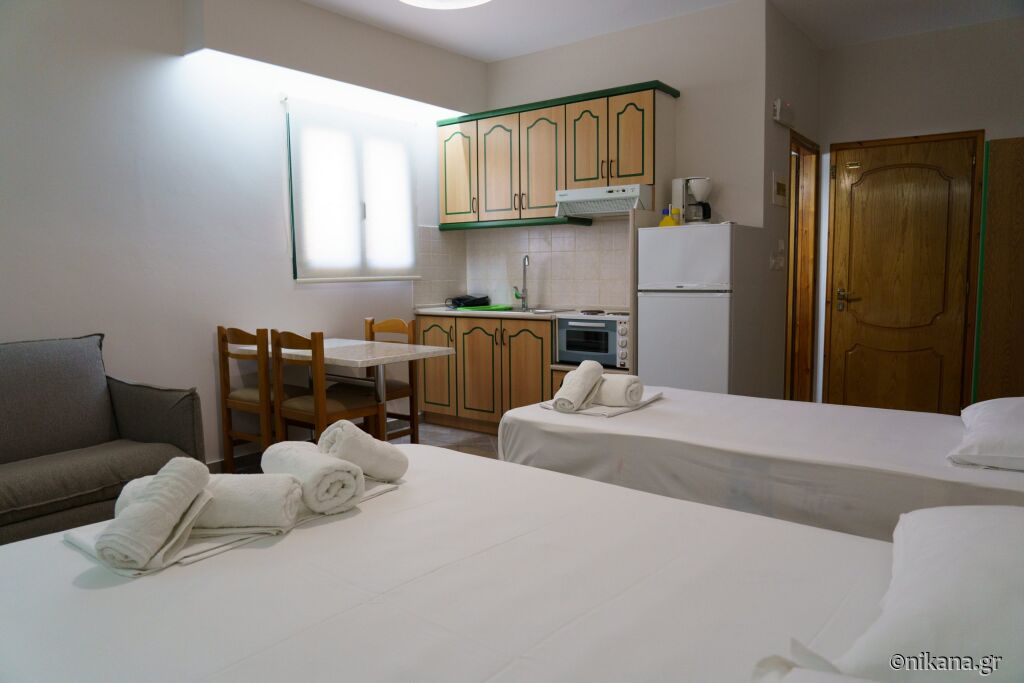 There are studios for three to four people (about 35m2), each with one double and one single bed, and a armchair (one studio has no armchair).