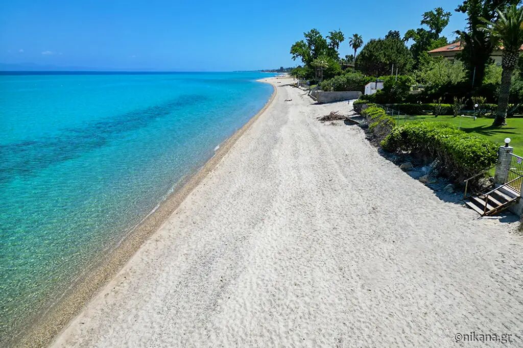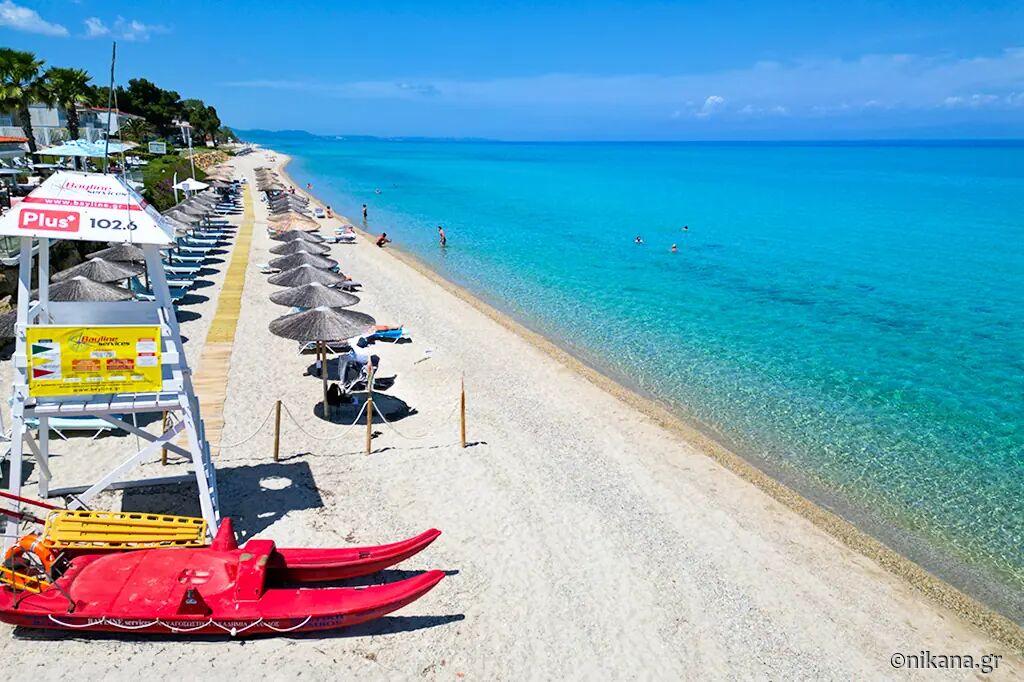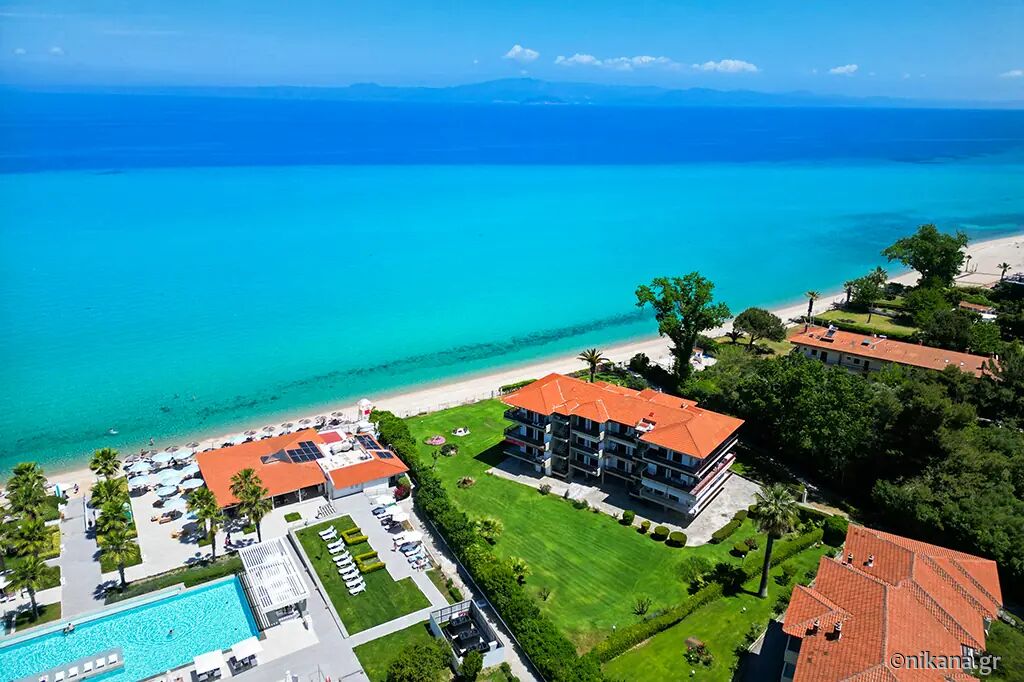 Hanioti is located on the eastern coast of the Kassandra peninsula and is one of Halkidiki’s most vibrant resorts. Once a quiet seaside village, today it is a favorite destination that successfully combines a relaxed Mediterranean atmosphere with modern tourist amenities. The town center is adorned with landscaped parks and flower-lined avenues, while the promenade is filled with restaurants, taverns, and cafés that reflect the lively spirit of the resort. The Blue Flag beach is known for its clear turquoise waters, sandy shore, and gradual entry into the sea, making it suitable for families with children. The pine trees in the background add a special charm to the summer atmosphere, while excursions to Lake Mavrobara and the Chapel of Saint George offer opportunities for quieter moments and insights into local tradition. The accommodation is located about 92 kilometers from Thessaloniki International Airport.