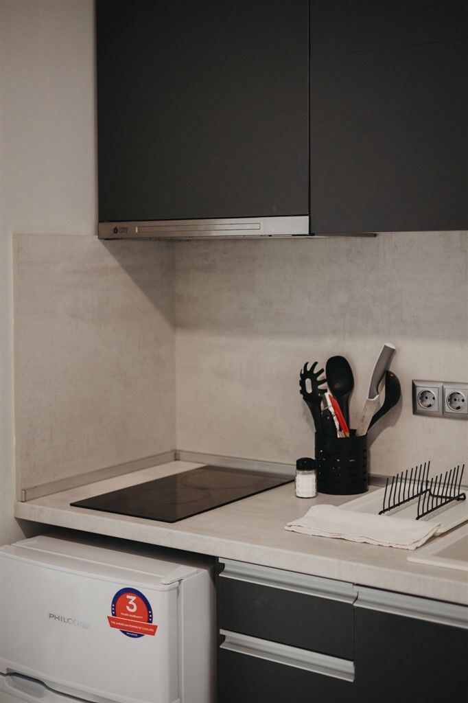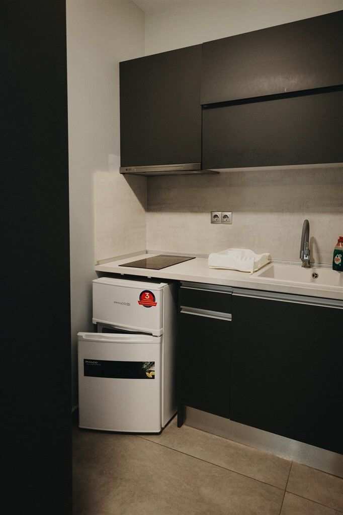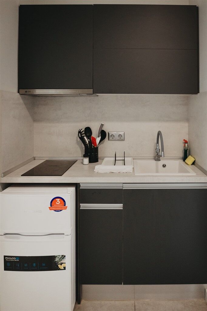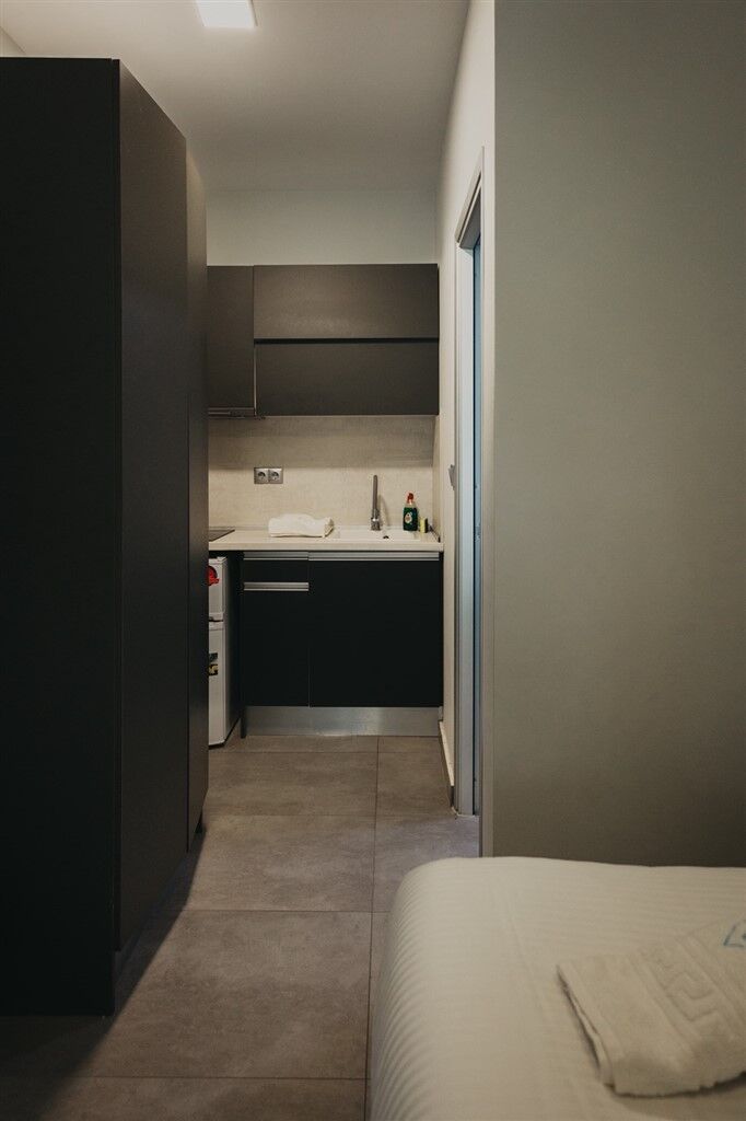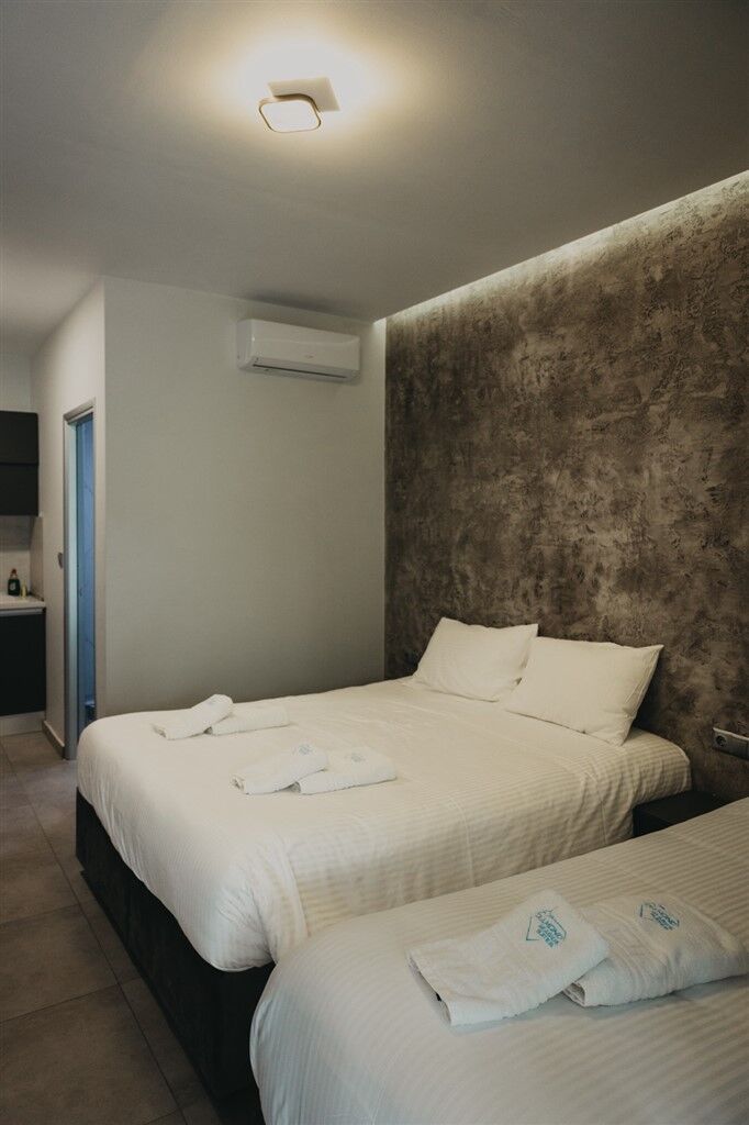 Triple studios are located on the third floor and are suitable for up to three adults. Each includes a sleeping area with a kitchenette and a bathroom, featuring one double bed and one single bed. Quadruple studios are also on the third floor and accommodate up to two adults and two children, with a double bed and a sofa bed for children.
