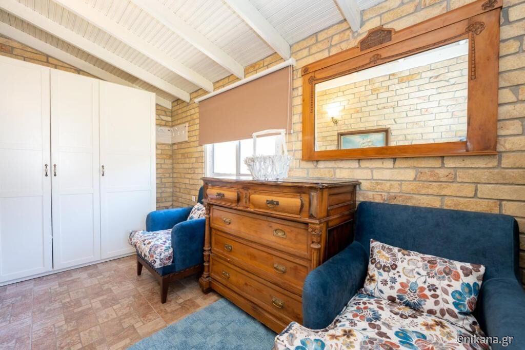 The villa has two levels. On the ground floor, there are three bedrooms, one with a double bed and two with two single beds each, and these rooms lead to a beautifully landscaped yard. There is also a washing machine on the ground floor. Upstairs, there is a spacious living room with a large double bed and a sofa, as well as a large and equipped kitchen and a bathroom. The living room leads to a large terrace overlooking the yard. In the yard, there is a separate building that has a large and equipped kitchen with a dining table and a separate room with a double bed and a bathroom. In front of this building, there is a gazebo with a dining table and a barbecue. Next to the gazebo, there is an outdoor, open shower and a pool with a table, chairs, and sun loungers.
