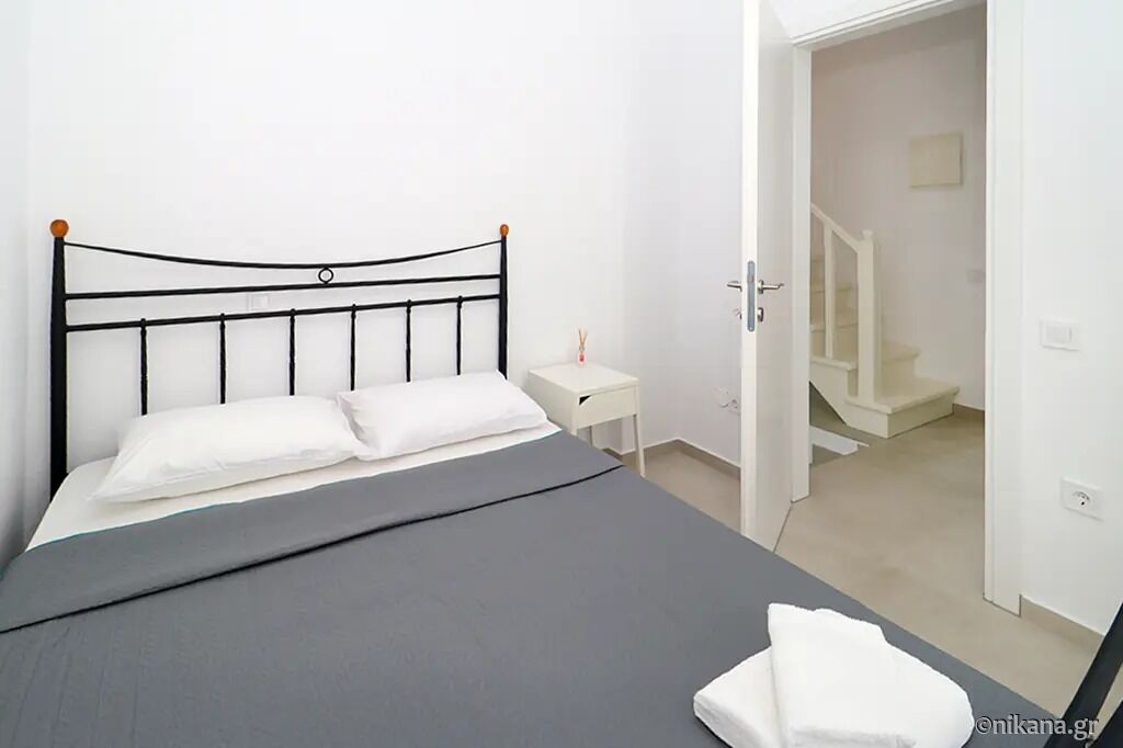Structurally, the property is a three-level maisonette designed to accommodate up to ten adults. On the first level, the ground floor, there is a living room and a kitchen with a dining area, while the second and third levels, corresponding to the first floor and attic, each feature two bedrooms and one bathroom. The bedrooms have a double bed each, while the living room has two single sofas.