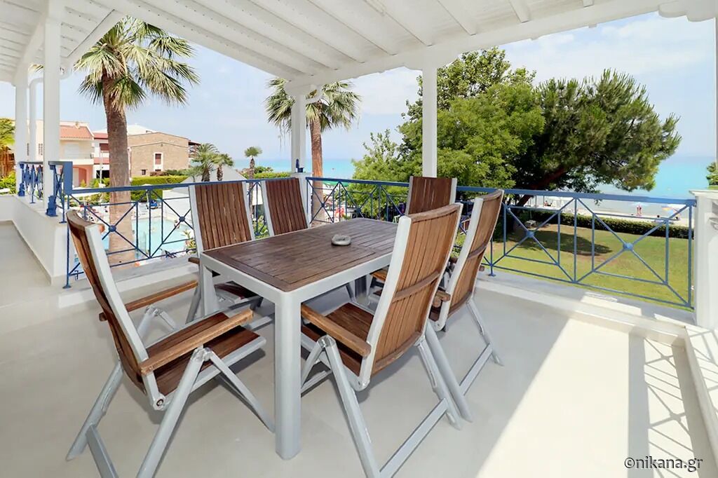 The ground floor features a veranda, and the first floor has two balconies. They are furnished with seating areas where guests can relax and enjoy the view.