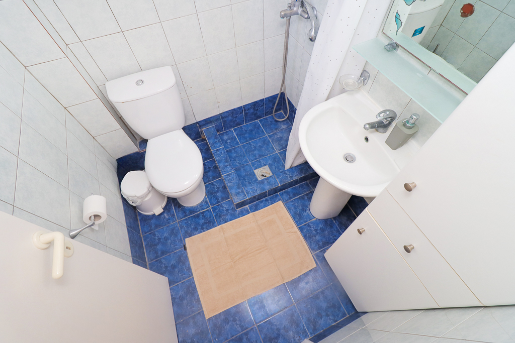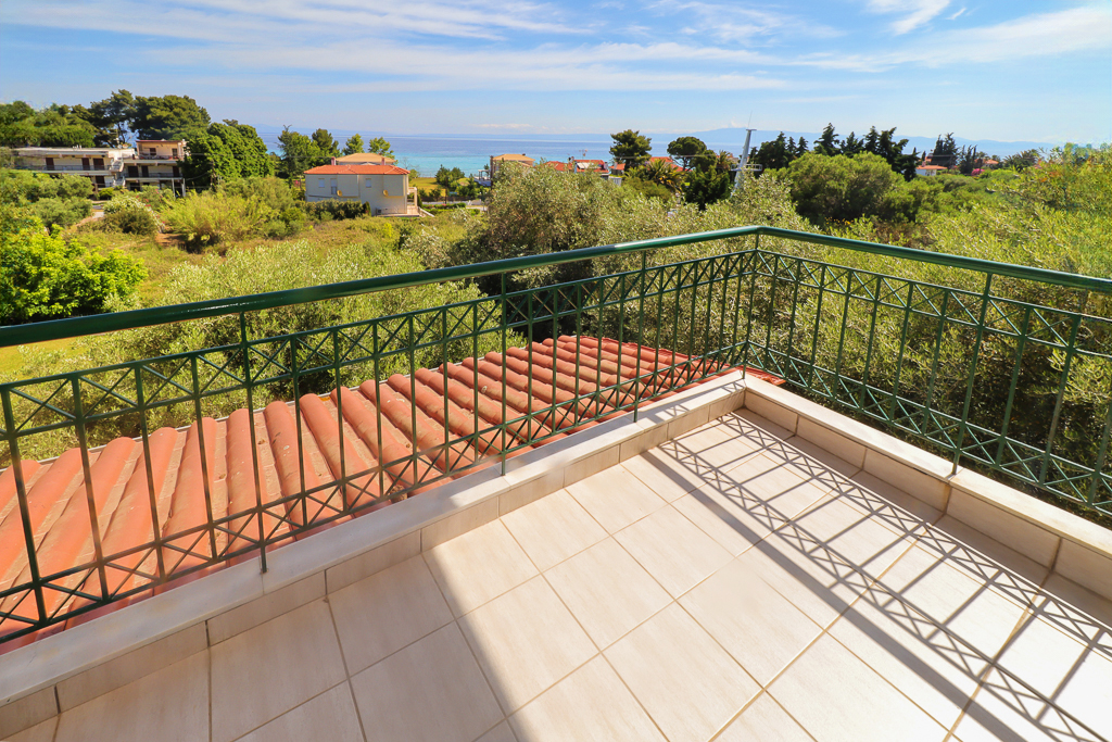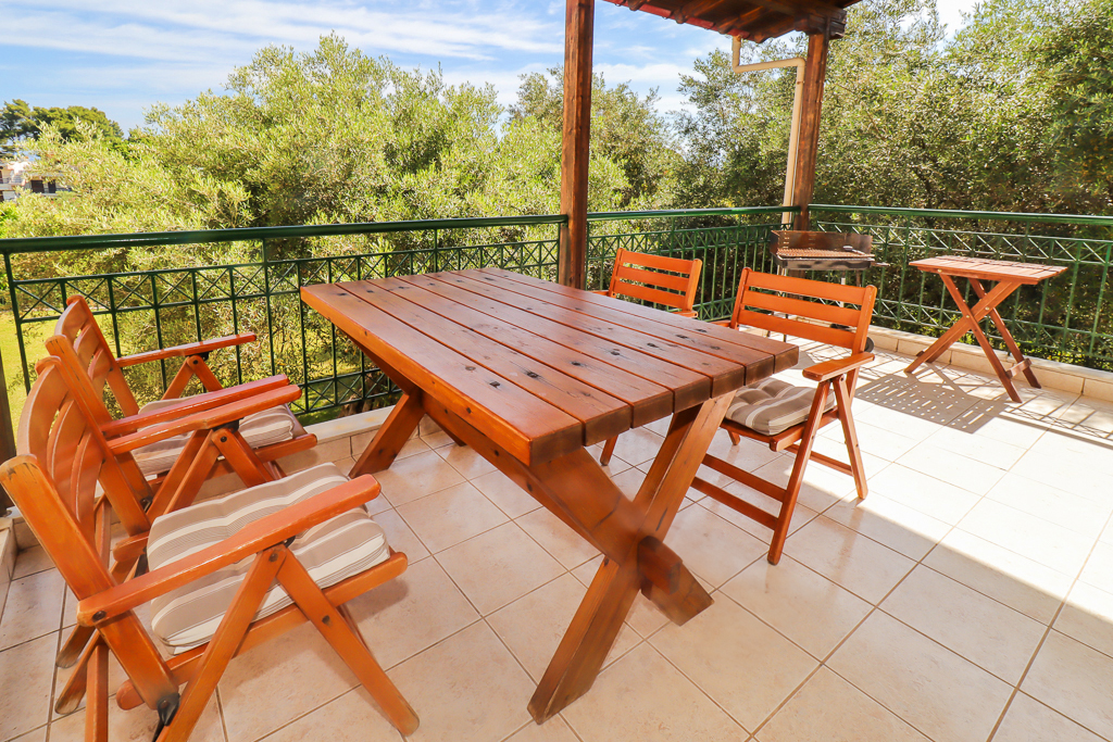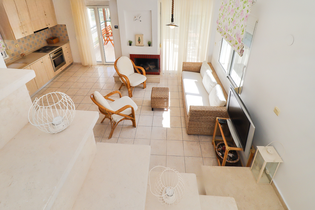 The balcony on the ground floor is equipped with seating, the view of the sea is obscured by an olive tree, which creates shade in the yard. From the terrace, which is accessed from the bedrooms, there is a view of the sea.