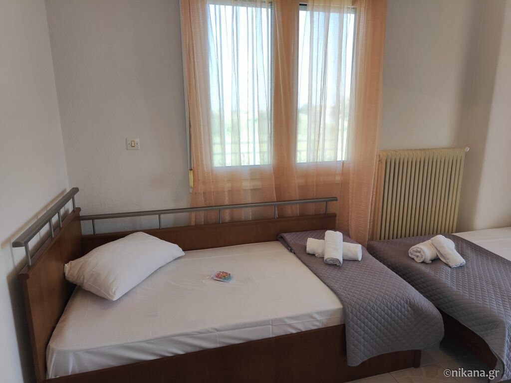 From every room and the spacious balcony you can admire views of the courtyard, neighboring villages and rolling foothills, with the Aegean Sea’s waves visible on the horizon. Breakfast and evening relaxation are especially pleasant in the gazebo or on the balcony, surrounded by silence and abundant shade. Guests have access to a private barbecue, shaded seating under the gazebo and a paved area in front of the villa—ideal for games and socializing.
