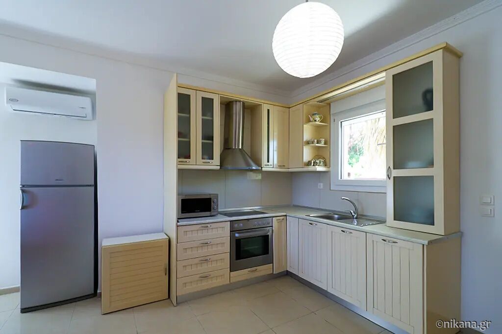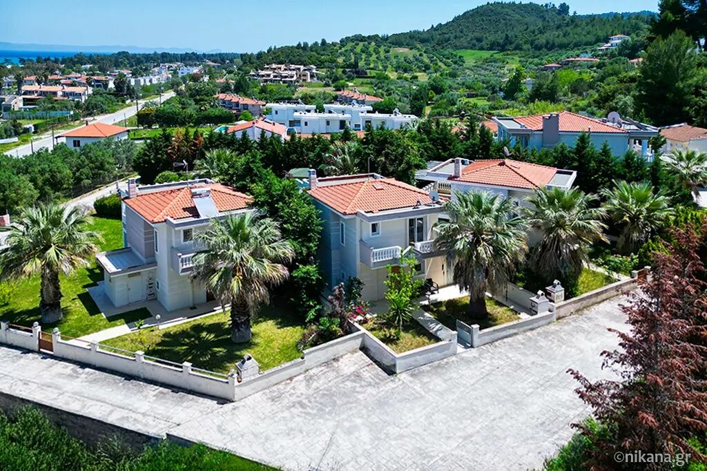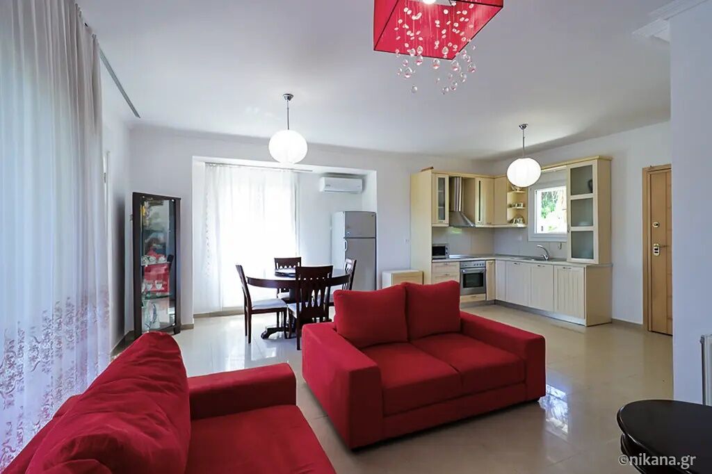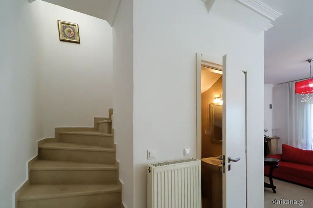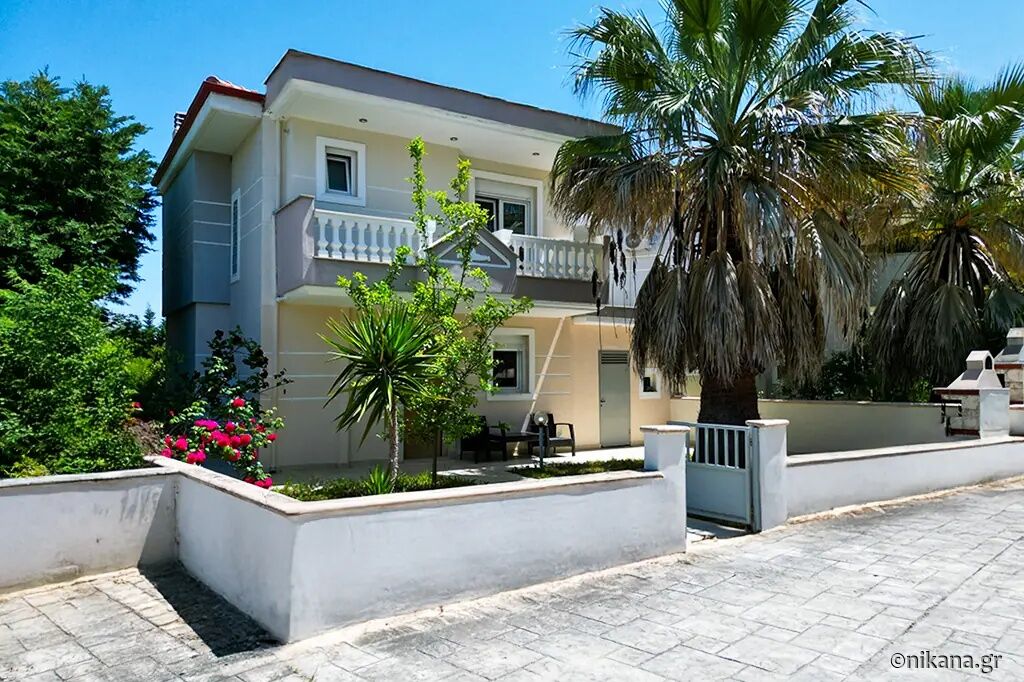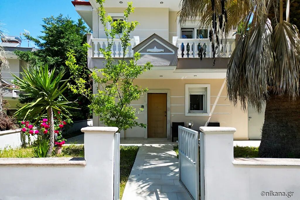 Petra House is situated in the popular resort of Pefkohori, on the eastern coast of the Kassandra peninsula, and represents an excellent choice for guests seeking comfortable, spacious, and functionally organized accommodation for larger groups or families. This two-level house is located 500 m away from the beach, nestled in a quieter part of town, surrounded by pleasant family homes and landscaped yards, yet still close enough to the center and the sea to allow for leisurely daily walks to the beach, restaurants, and evening entertainment. The advantage of this accommodation lies in its ample capacity, the privacy it offers, the well-maintained and fenced yard, and the fact that it is a suitable choice for an extended stay by the sea.