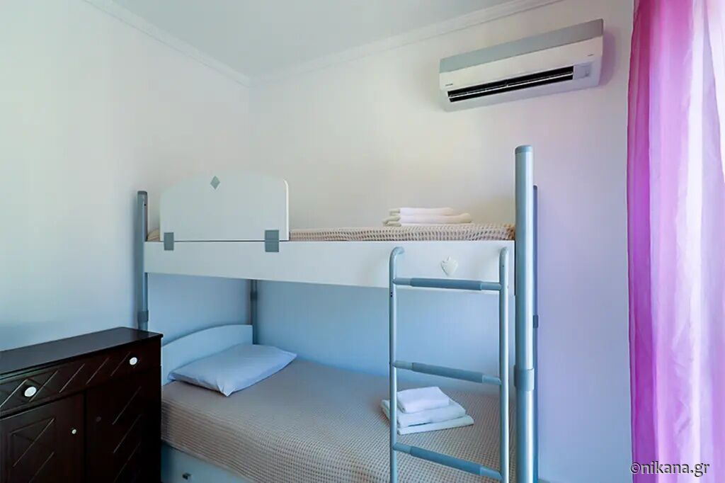 The house is arranged on two levels and is intended to accommodate a maximum of eight adults. On the ground floor, there is a living room, kitchen, and toilet, while on the first floor, there are three bedrooms and a bathroom. The first and second bedrooms are equipped with queen-size beds, while the third bedroom features bunk beds, making this house suitable for both groups of friends and families with children. The living room contains two single sofas, further increasing the capacity and flexibility of the accommodation. All rooms are clearly separated, functionally arranged, and provide enough space for the stay of a larger number of guests, with the possibility of privacy for each member of the group.