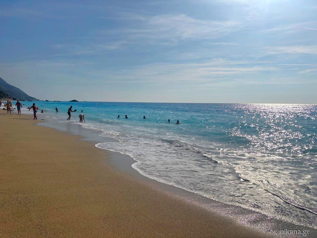 It’s great for all who come to Lefkada without their own car, because there are local buses to this beach every day. The road to the beach is safe even for the motor scooters. There are several accommodation facilities on the beach, and also few beach bars with a pool which guests could use.