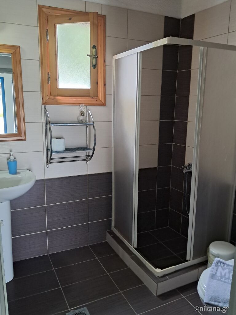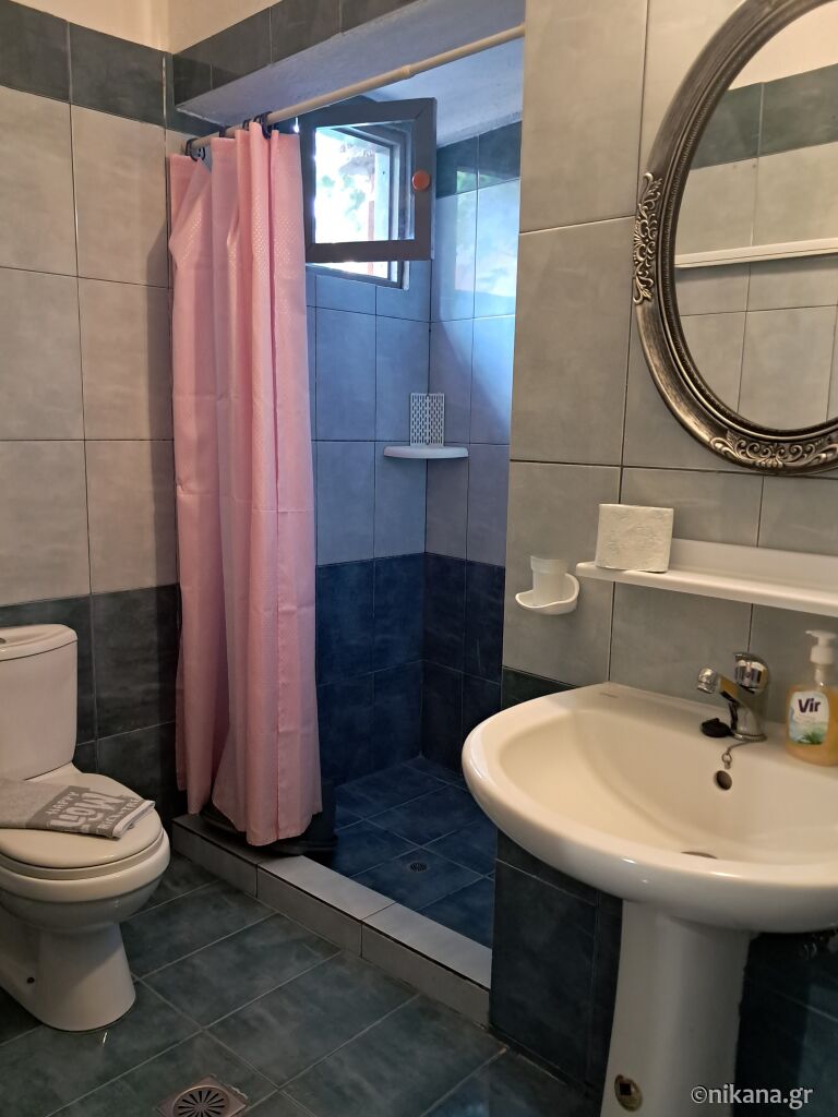 On the first floor, there is an apartment (30m2) with a double bed in the bedroom and two single beds in the room with the kitchen. The bathroom is modestly equipped and has a shower with a curtain. The adjacent apartment (40m2) is located at the corner of the house and has a large corner terrace overlooking the courtyard, a double bed in the bedroom, and a living room with a kitchen, dining table with chairs, a single bed, and a single sofa bed. The bathroom has a shower with a curtain. The balconies of these two apartments are separated by large flowerpots.