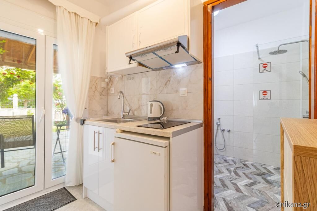 Chrisiis Apartments is nestled in the heart of vibrant Nikiti and stands out for its warm atmosphere and thoughtfully curated surroundings. Situated just 350 m from the sandy Nikiti beach on the Sithonia peninsula, this cozy retreat, shaded by lush olive trees and rose bushes, offers guests a peaceful escape from the bustle of everyday life, while still granting easy access to the area’s most beautiful beaches for those eager to explore. The verdant courtyard invites relaxation, and with Nikiti’s center and its local tavernas only a few minutes’ walk away, Chrisiis Apartments makes an ideal base for anyone wishing to experience the authentic charm of Halkidiki.