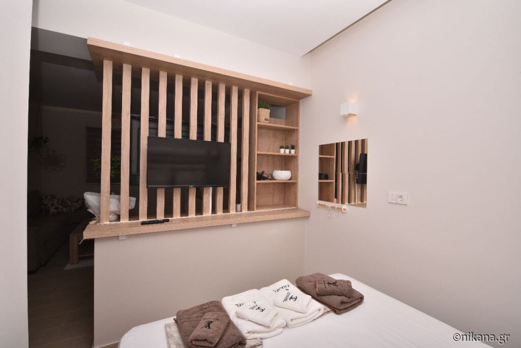 The studio is situated on the ground floor and can accommodate up to four adults. It consists of a bathroom and a fully equipped kitchen with a double bed and a sofa for two.