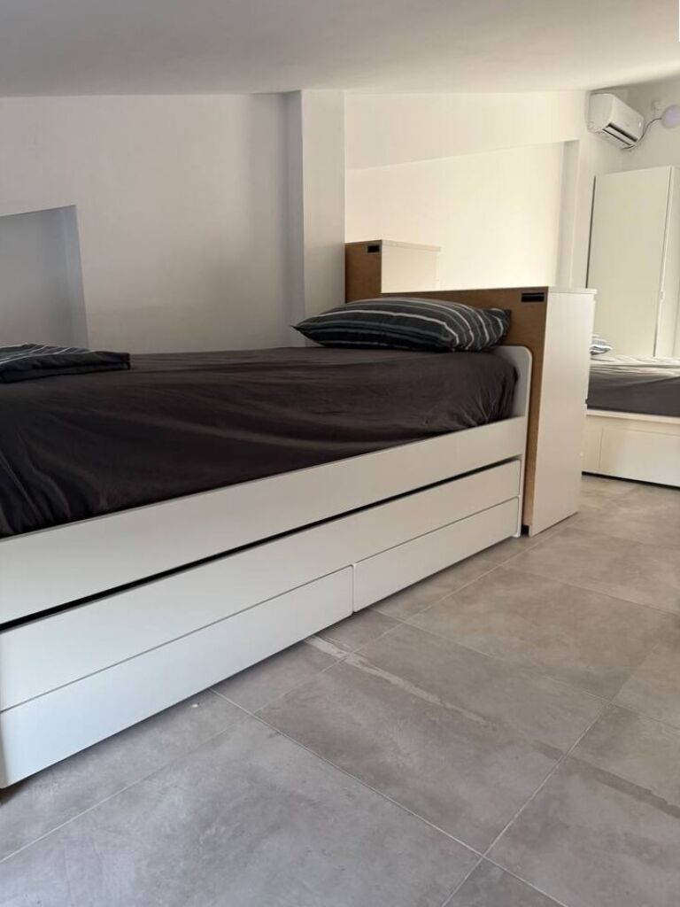 The apartment, which is structured as a maisonette, is spread over two levels and can accommodate up to six adults and two children. On the lower level, corresponding to the first floor, there is a living room with a kitchen, a bedroom, and a bathroom, while on the upper level, corresponding to the second floor, there is an open gallery and a toilet. The bedroom features a double bed, the open gallery includes a double bed and a single bed with a pull-out bed, and the living room offers a sofa for two people.