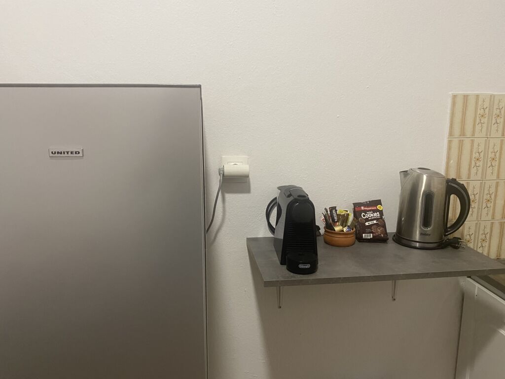 The air-conditioned unit features a TV, internet, kitchen, bathroom, and terrace. The kitchen is standardly equipped and includes two hot plates, a coffee machine, a kettle, and a standard refrigerator. The bathroom has a shower. The terrace is furnished with a table and chairs.