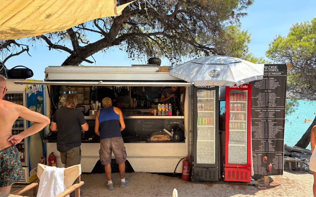 On the left bay, which is both larger and more beautiful, but also on the right, there are sunbeds and umbrellas, so there is very little space left for those who have their own equipment. Above the beach is a canteen with fast food and drinks.