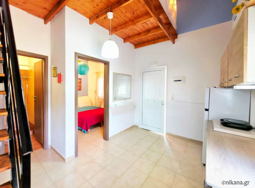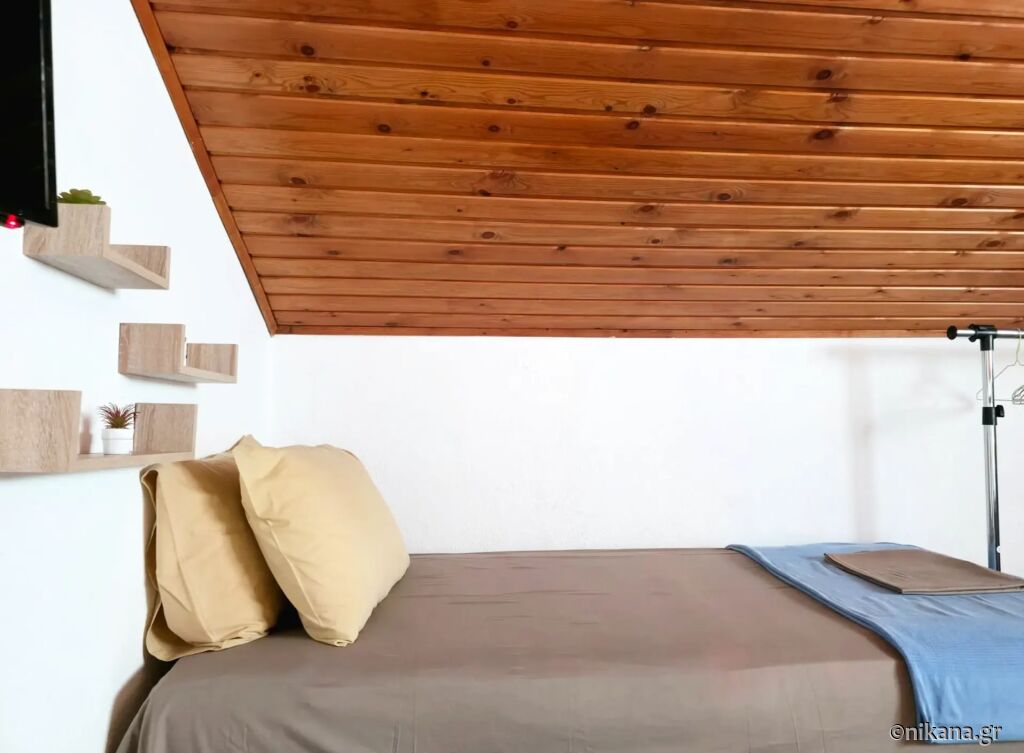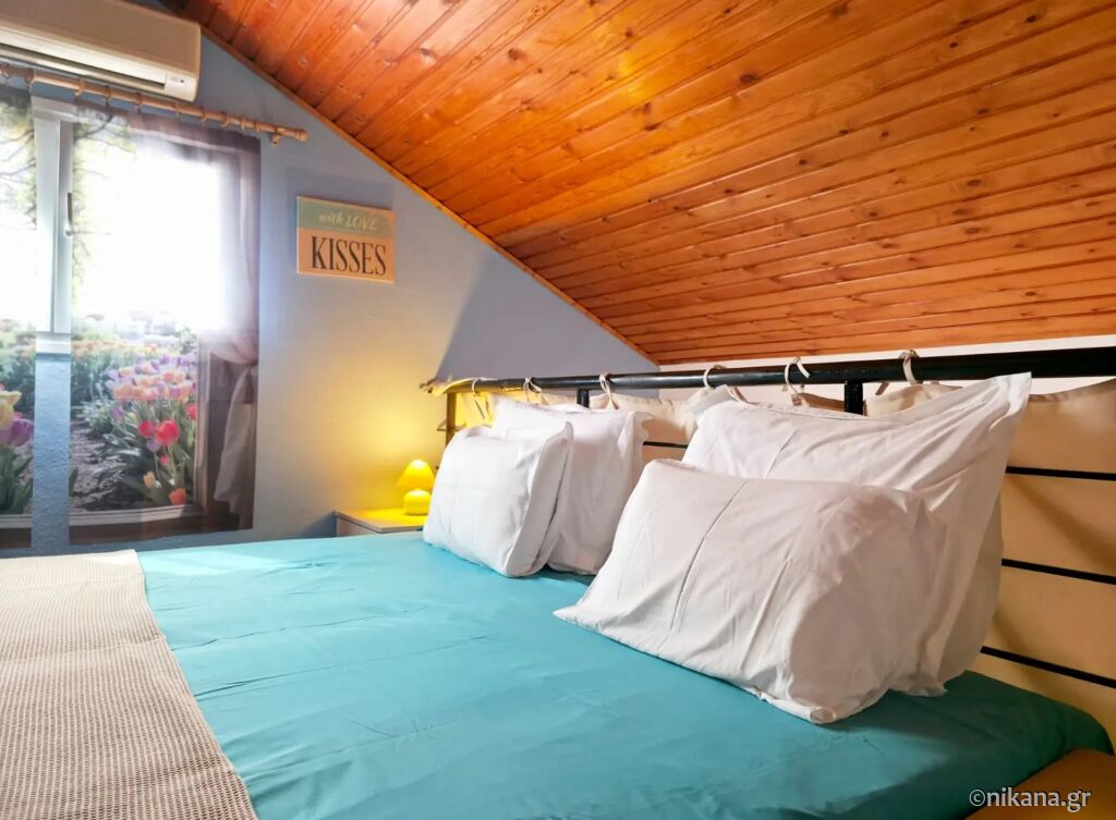 The house is organized on two levels, the ground floor and the attic. It is designed to accommodate up to five adults. On the ground floor there is a bedroom with a double bed, a fully equipped kitchen, and a bathroom. The upper level features an open sleeping area with one large double bed and one single bed. The space is bright and welcoming, filled with natural light and warmth, highlighted by the wooden ceiling, soft tones, and carefully chosen details. The indoor staircase connects the two levels and blends harmoniously with the modern interior design.