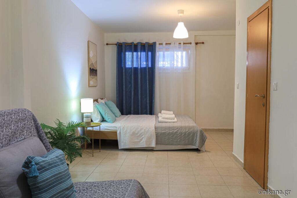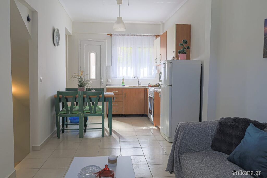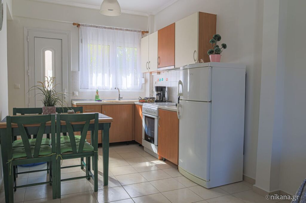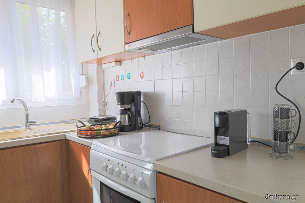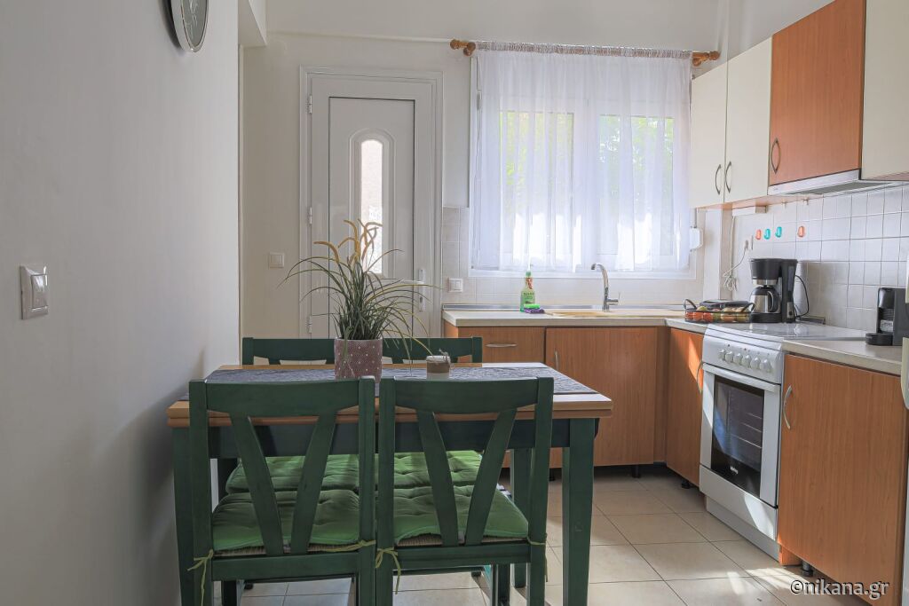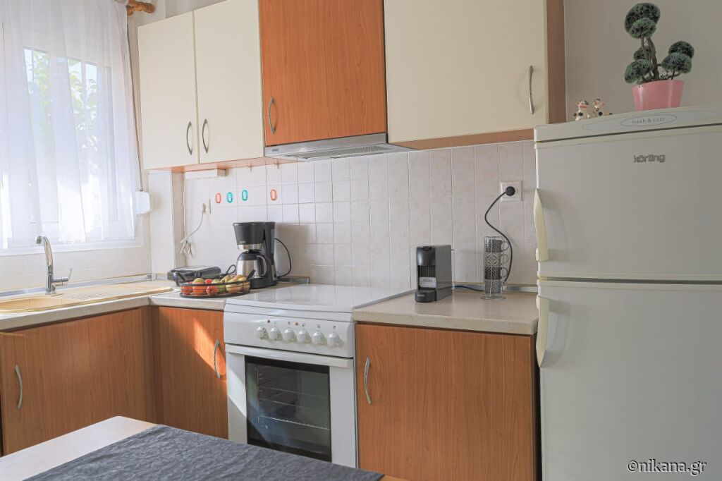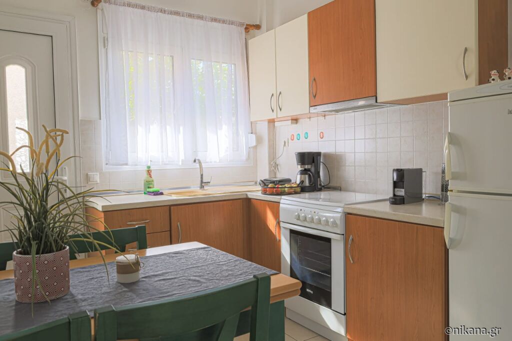 The unit is fully equipped for a long and comfortable stay. There are two air conditioning units that cool the upper bedroom and the basement, while a fan is located in the living room on the raised ground floor. WiFi is available and free of charge, and guests have access to a TV with domestic channels in the living room, a hair dryer, and a clothes iron. The kitchen is modern and fully equipped with four cooking plates, a large oven, a spacious fridge with freezer, an electric kettle, a coffee maker, a toaster, and a dishwasher. Everything is tailored to the needs of families and groups who prefer preparing their meals independently during the vacation.