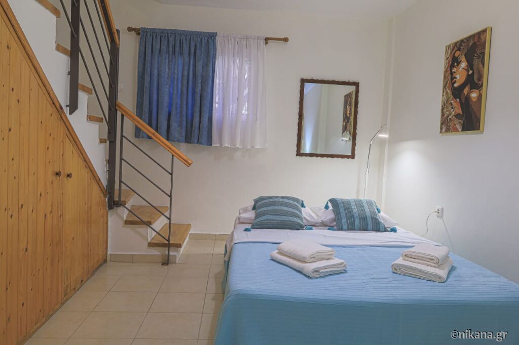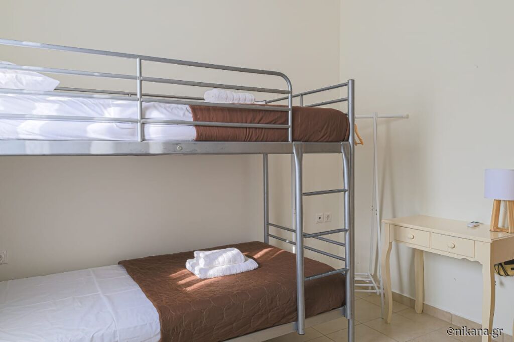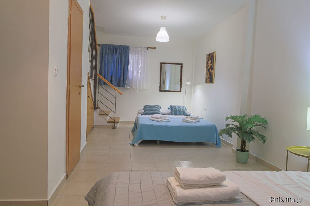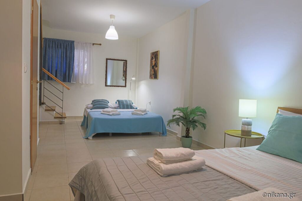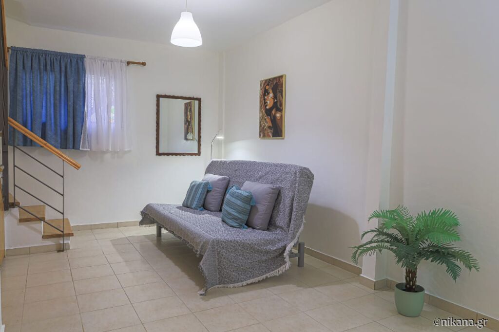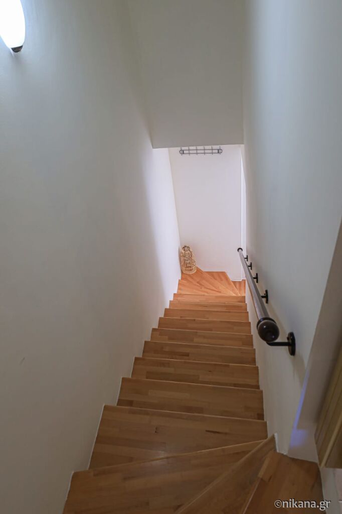 Jessi’s Villa is organized as a three-level maisonette and can comfortably accommodate up to eight adults. It consists of a basement, a raised ground floor, and a first floor. In the basement, there is an open sleeping area with a double bed and a sofa, as well as a bathroom. On the raised ground floor, there is a bright and modern living room, along with an additional bathroom. The first floor features two separate bedrooms and a third bathroom. One bedroom is equipped with a double bed, while the other has bunk beds and one single bed. All rooms are well distributed and connected by an internal staircase, with plenty of natural light and an airy feel throughout the house.