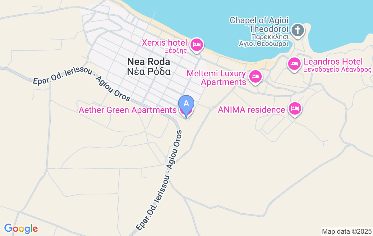 Aether Green Apartments se află pe peninsula Athos, în Nea Rodi - un mic oraș, perfect pentru o vacanță liniștită, cu o promenadă frumoasă de-a lungul mării, de-a lungul căreia se află restaurante și cafenele cu o vedere fantastică la mare, perfecte pentru a vă bucura de mâncare, băuturi și peisaj. Această locație este situată la aproximativ 550m de plajă în oraș.