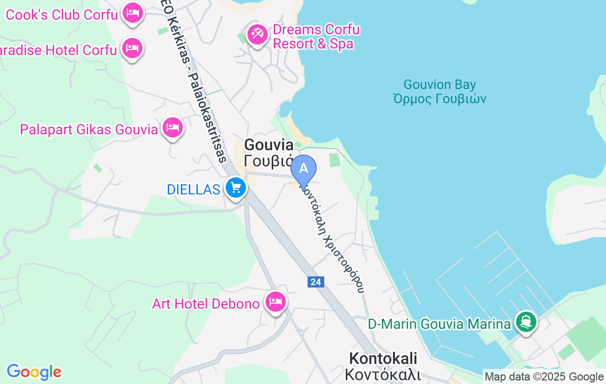 La 250m de hotel se afla o statie de autobuz cu transport frecvent catre capitala, aflata la 8km, precum si catre aeroportul international, aflat la 9km. Gouvia Hotel se află la 7,5km de portul din orașul Corfu.