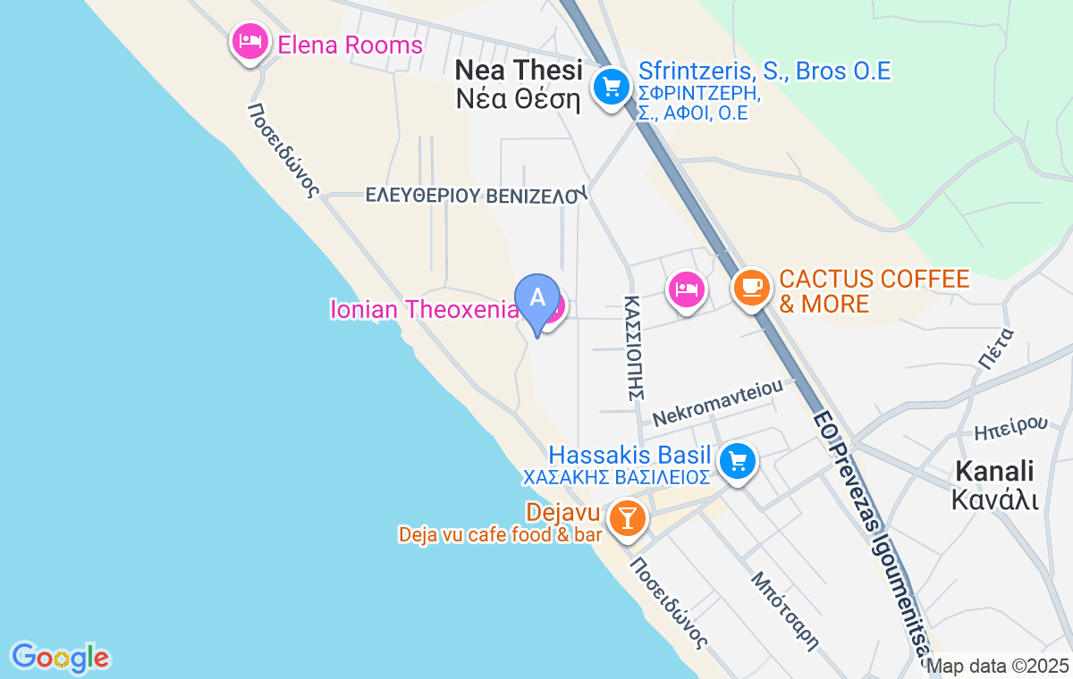 Hotelul Ionian Theoxenia este situat în Kanali și este despărțit de plajă doar de o stradă slab circulată. Facilitățile includ o recepție deschisă non-stop, seif (contra cost), piscină cu zonă pentru copii și bar, bar principal, restaurant, bar de gustări, lift, sală de televiziune, sală de fitness, saună și terenuri de tenis și baschet.