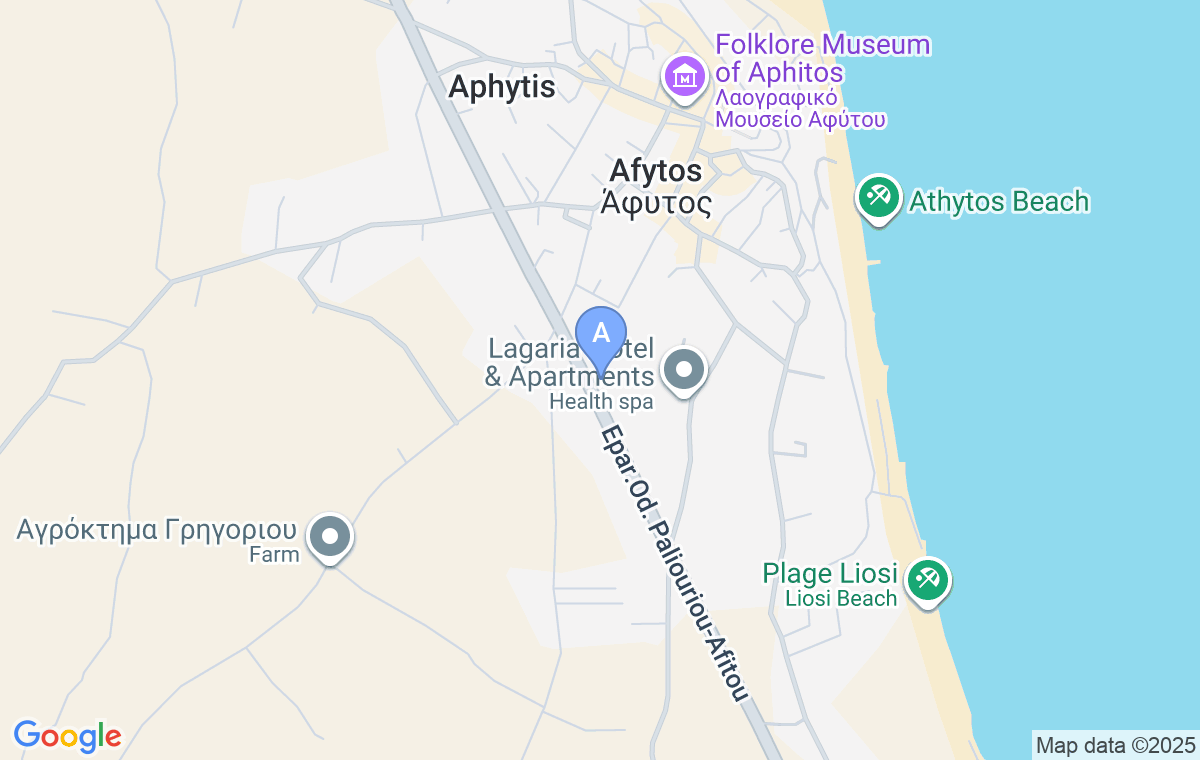 Sinodinos Deluxe Apartments este situat pe coasta de nord-est a Kassandra, în localitatea Afitos, la 850 m de plaja cu același nume, care este caracterizată de apa turcoaz. La o distanță de 600 m se află piața centrală din Afitos, unde se găsesc numeroase taverne și restaurante, precum și farmacii, magazine și centre medicale.