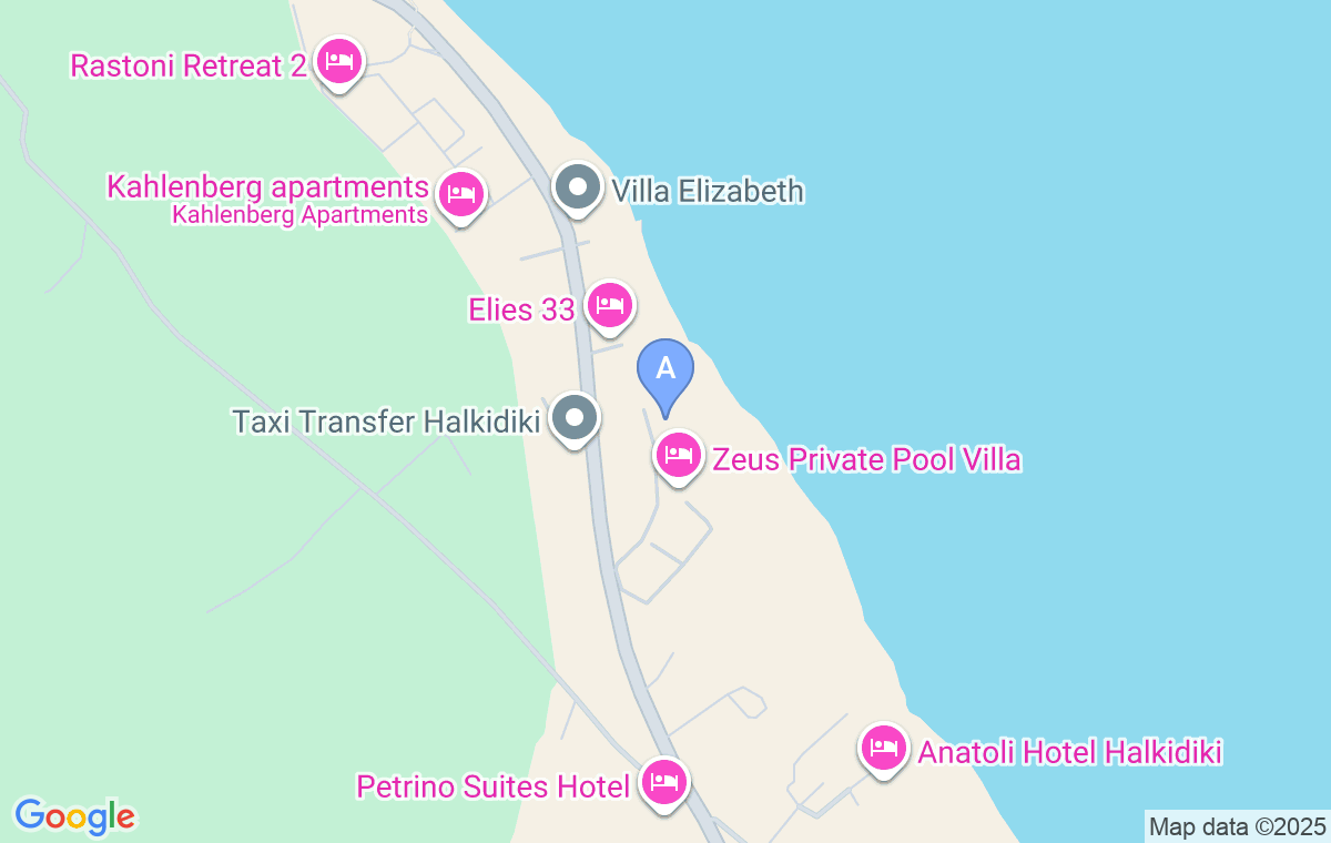 The Stone of Zeus Villa se află pe malul nord-estic al peninsulei Kassandra, în pitorescul sat Afitos, care emană spirit mediteranean și te întoarce în vremurile trecute. Locația se află pe o colină de unde se poate admira o priveliște impresionantă asupra albastrului mării, la aproximativ 180m distanță de plaja cu nisip și pietriș la care se coboară pe o pantă.