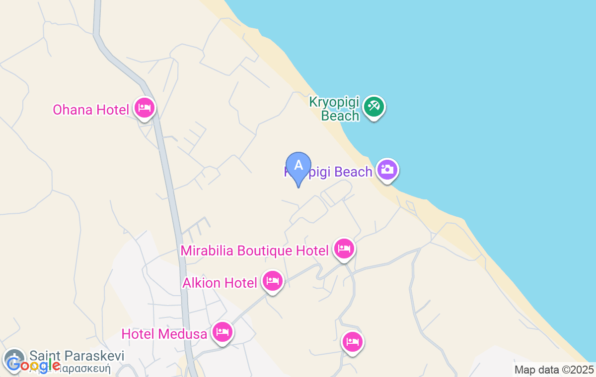 Este situat într-o zonă liniștită din Kriopigi, pe peninsula Kassandra, iar o potecă abruptă de coborâre duce la plaja neîmprejmuită cu umbră naturală, care se află la aproximativ 250m distanță, așa că coborârea și urcarea poate fi o sarcină dificilă pentru indivizi. Primele magazine și cafenele sunt situate la aproximativ 850m, în centrul orașului.