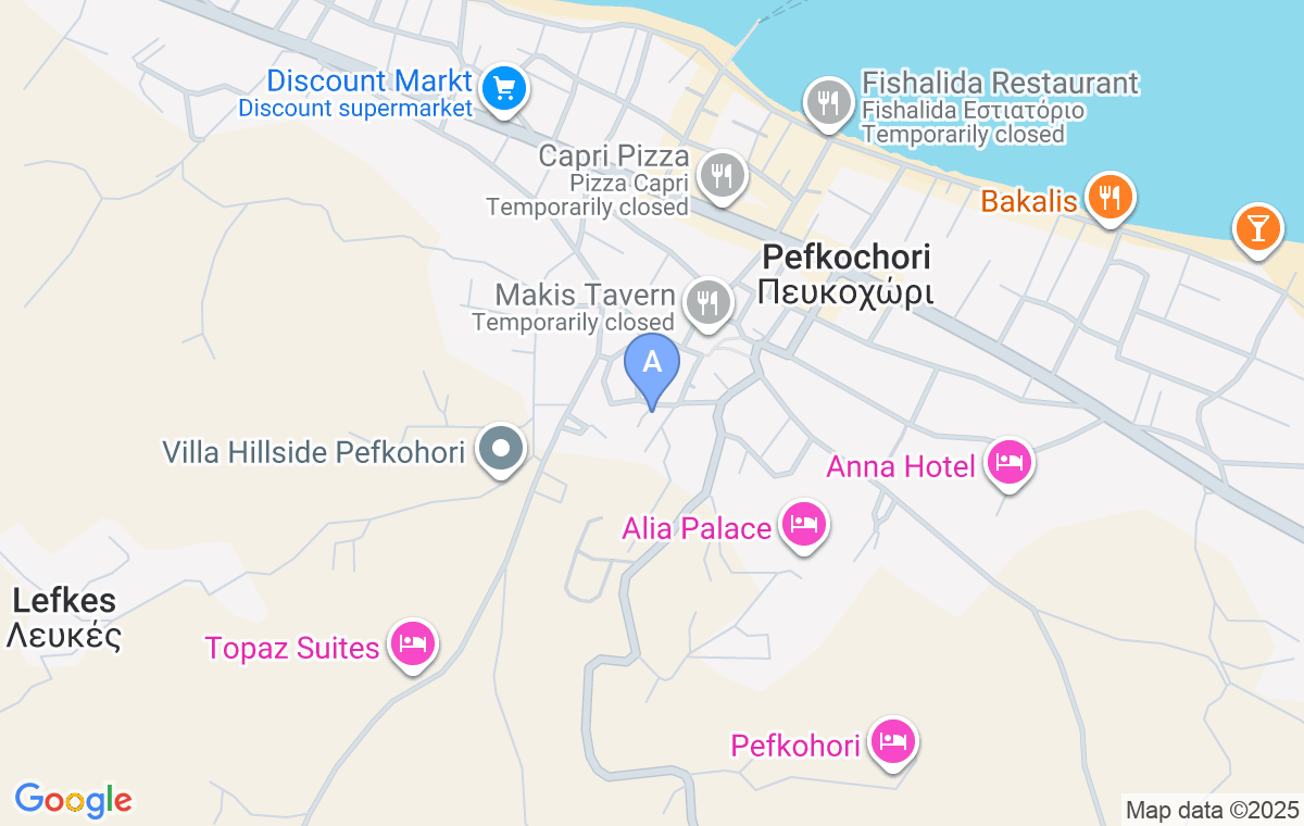 Se află într-o zonă liniștită (450m de mare), în apropiere de piața veche (100m) și de frumoasa biserică, respectiv de centrul Pefkohoriei. Este ideal pentru o familie de patru persoane. În apropiere se află magazine, restaurante, pizzerii și taverne cu mâncare și muzică grecească.