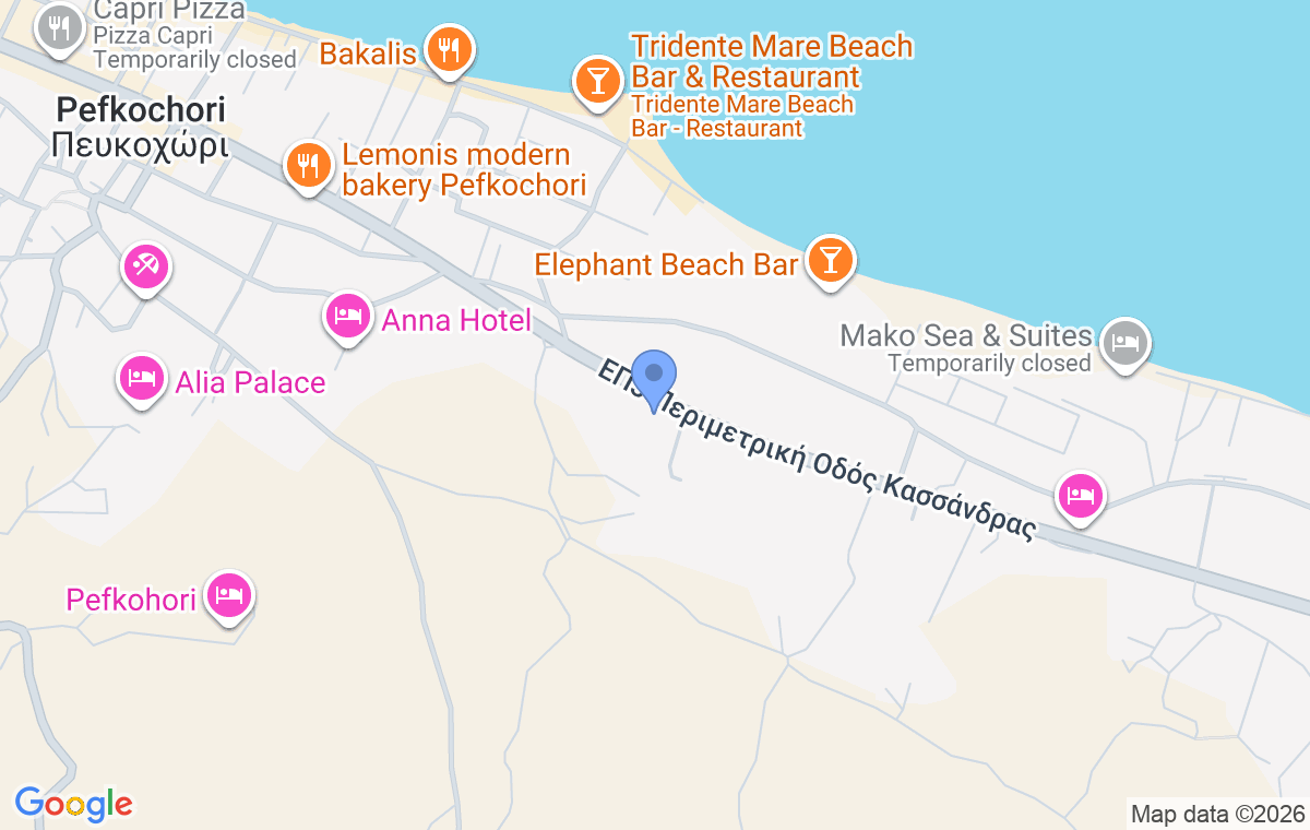 Assos Luxury Villas se află la 5 km distanță de Haniotis, la 9 km de Polihrono, la 6 km de plaja Xenia, iar cel mai apropiat aeroport din Salonic se găsește la o distanță de 96 km.