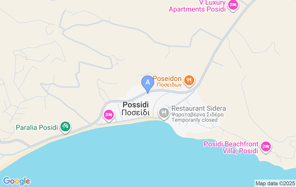 Vila Possidi Studios se află la doar 100 de metri de plajă și de centrul localității. La plajă se ajunge printr-o plimbare ușoară și scurtă. Oferă cazare în studiouri luminoase și plăcute, cu trei și patru paturi. Toate unitățile sunt dotate cu o chicinetă (plită cu două arzătoare) cu frigider, baie cu cabină de duș, televizor LCD și aer condiționat (contra cost). Vila este amplasată într-o curte autentic mediteraneană, la care se poate avea acces direct de pe drumul principal. Studiourile se află la parter, fiecare având propriul său patio cu mobilier de exterior și la primul etaj, de unde se poate admira o panoramă către mare și Posidi. Parcarea este asigurată pentru toți vizitatorii vilei, aceasta fiind situată în fața clădirii și în cazul în care este ocupată, oaspeții pot parca în fața casei. Locul de parcare nu poate fi rezervat. Vila este ideal poziționată, înconjurată de vegetație mediteraneană și în apropiere se află magazine, brutării, măcelării și tot ce este necesar pentru o vacanță plăcută. La mai puțin de două mii de metri se află un banc de nisip pentru care Posidi este cunoscut în toată regiunea, precum și farul vechi. Se asigură prosoape și internet Wi-Fi pentru oaspeți. Vila acceptă animale de companie.