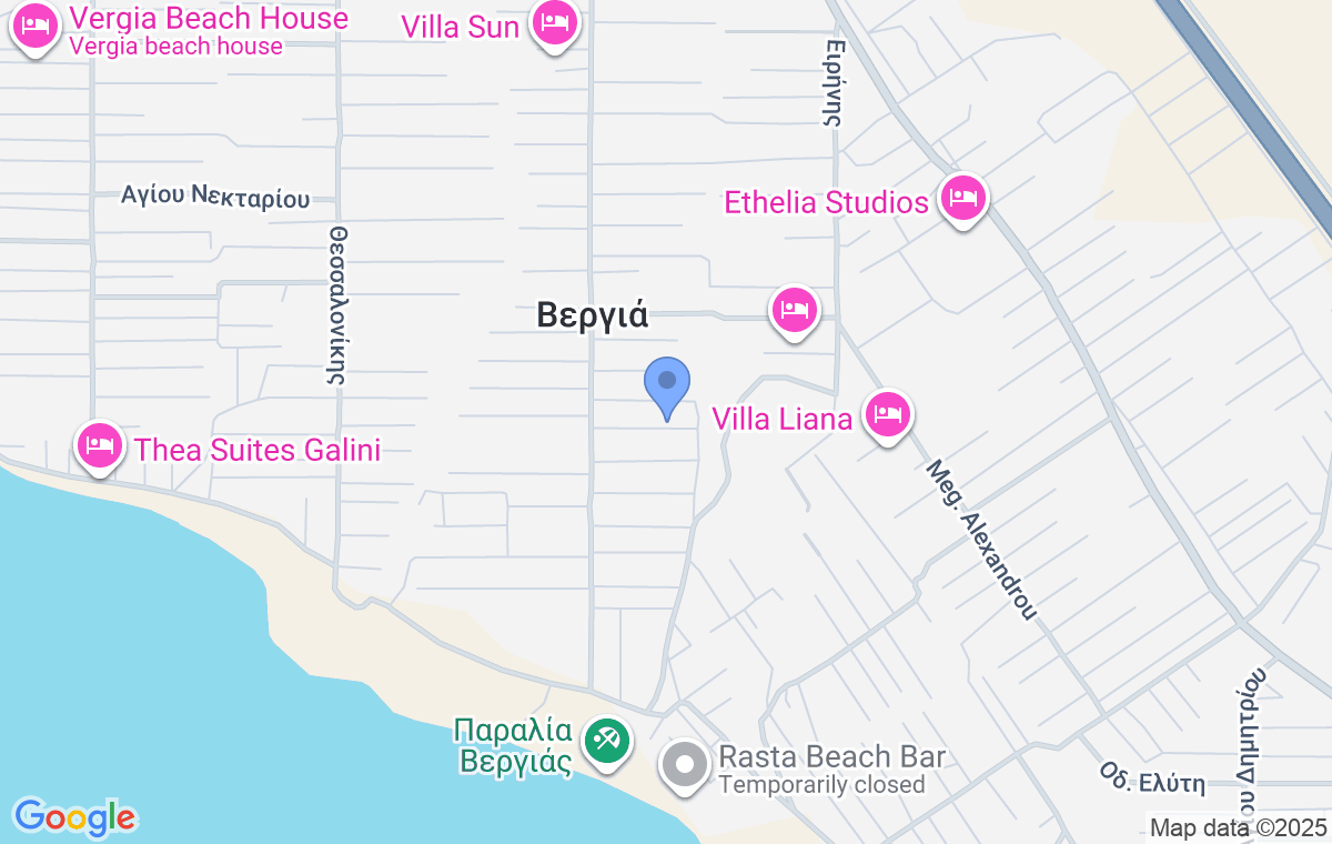 Vergia este un fermecător sat de coastă situat în Golful Salonic, între Nea Kallikratia și Sozopolis, care cucerește vizitatorii cu plaja sa lungă de nisip, marea cristalină și atmosfera liniștită. Ca alternativă mai liniștită la centrele turistice mai mari din Halkidiki, este ideal pentru familii și pentru cei care caută o vacanță într-un mediu autentic grecesc. Plaja Vergia oferă un echilibru perfect între mediu natural și facilități moderne - de la zonele potrivite pentru propria umbrelă de soare până la zonele amenajate cu șezlonguri și baruri. Intrarea ușoară în apă o face potrivită pentru copii, în timp ce serile liniștite de-a lungul malului aduc un sentiment de relaxare și farmec local. Deși satul în sine nu are monumente istorice semnificative, poziția sa în regiunea Halkidiki, bogată în moștenirea Greciei antice, Bizanțului și perioadei otomane, îl face un punct de plecare excelent pentru explorarea peninsulei Kassandra și a atracțiilor înconjurătoare. O combinație de mediu natural, facilități pentru familie și căldura spiritului grecesc face din Vergia un loc pentru o vacanță liniștită și relaxantă, departe de agitația orașului. Cazarea este situată la aproximativ 36 de kilometri de aeroportul internațional din Salonic.