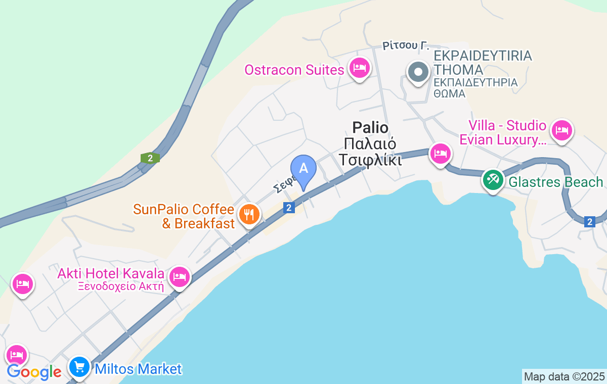 Aetheris Houses se află în centrul localității Palio, în apropiere de Kavala, la doar câțiva pași de mare și plajă, în vecinătatea restaurantelor și cafenelelor. Proprietatea are apartamente cu două camere și o curte frumos amenajată.