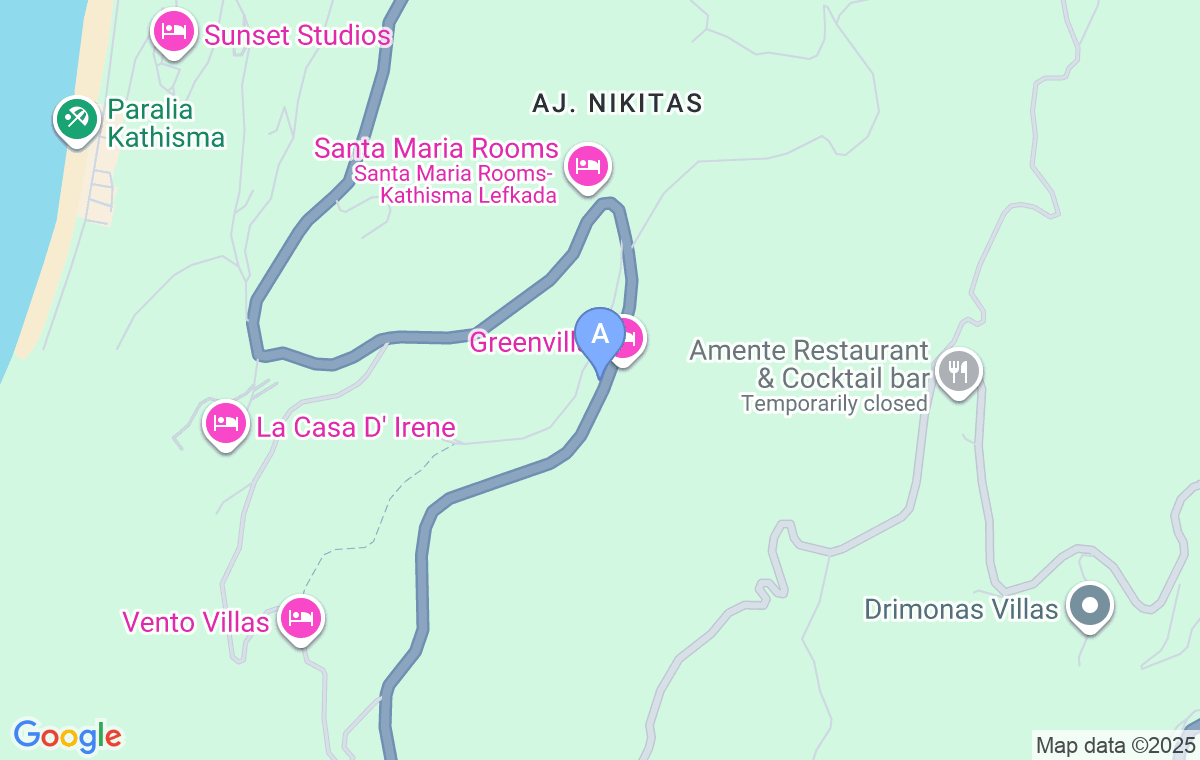 Puteți ajunge la proprietatea noastră conducând de la Lefkada, pe o distanță de 10 km, trecând pe lângă Agios Nikitas, trecând de virajul către plaja Kathisma și după 1,5 km, pe partea dreaptă a drumului, veți vedea poarta vilei.