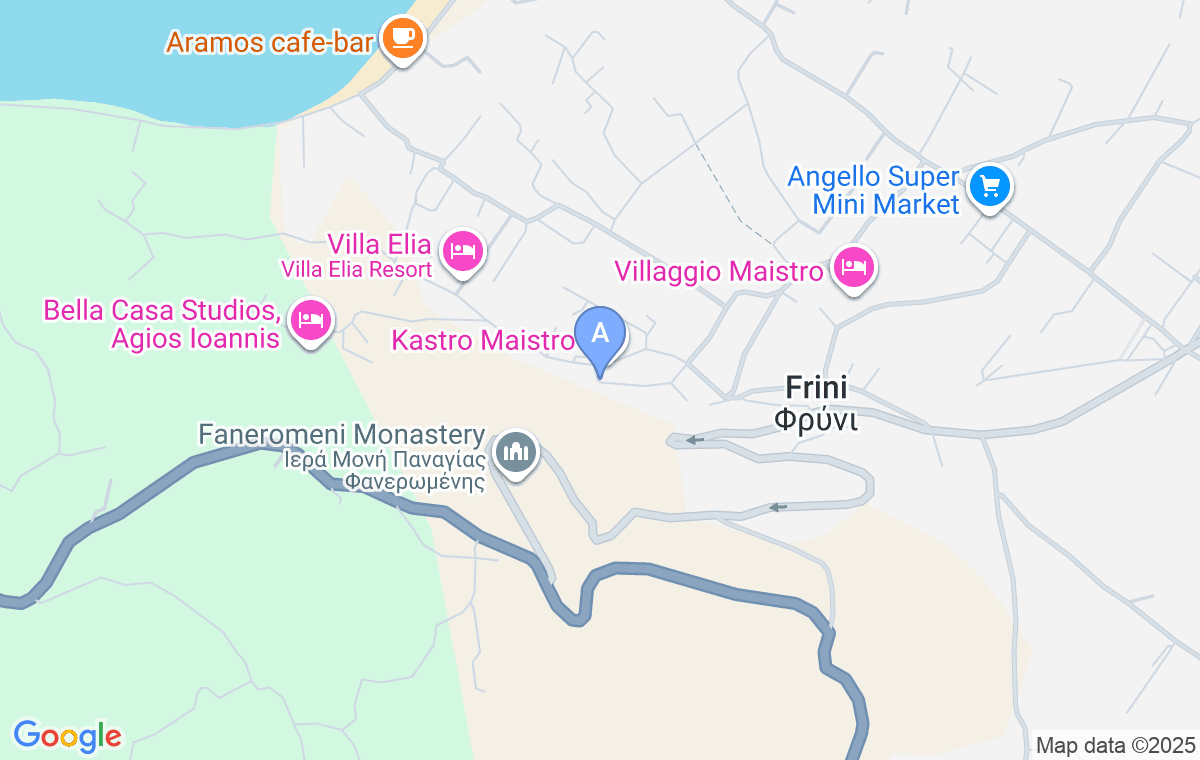 După ce ajungeți pe insulă prin pod, mergeți în Lefkada și continuați în dreapta încă 1 kilometru până la intersecție. De acolo, mergeți înainte și urmați indicatoarele către zona Frini. La 200 de metri după ce treceți de Frini, veți vedea Kastro Maistro Apartments situat pe o colină la stânga.