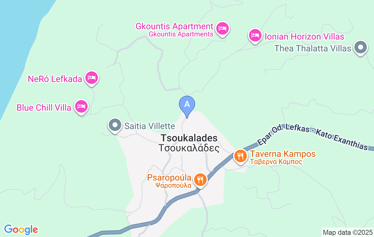 Cea mai apropiată brutărie și magazin alimentar se află la 350 de metri distanță. Centrul Lefkada și Agios Nikitas sunt la aproximativ 6 km distanță, iar plaja Kaminia se află la aproximativ 1,5 km distanță.