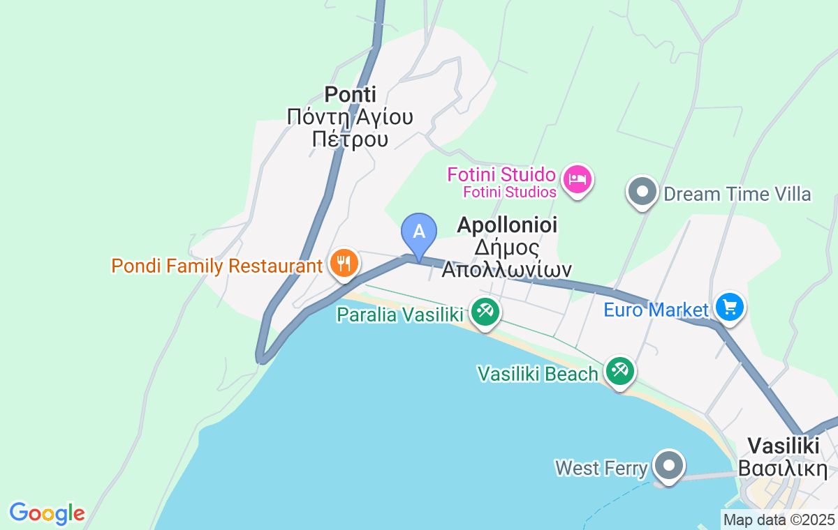 Pentru a ajunge la vilă, trebuie să intrați în Vasiliki, să treceți de stația de benzină Petrol, să virați la dreapta la prima intersecție, să conduceți încă 120 de metri și apoi să virați la dreapta către locul și plaja Pondi. Conduceți încă 500 de metri înainte, pe drumul principal, până când vedeți Savinos Rooms pe partea stângă.