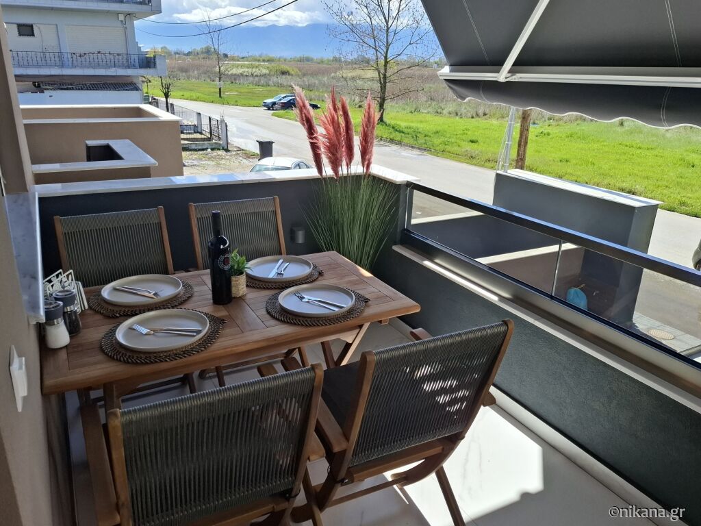 Pe balcon, echipat cu o masă și scaune pentru luat masa, oaspeții se pot relaxa și bucura de priveliștea asupra muntelui Olimp și a curții frumos amenajate, având și posibilitatea de a folosi un grătar privat pentru o vacanță completă.