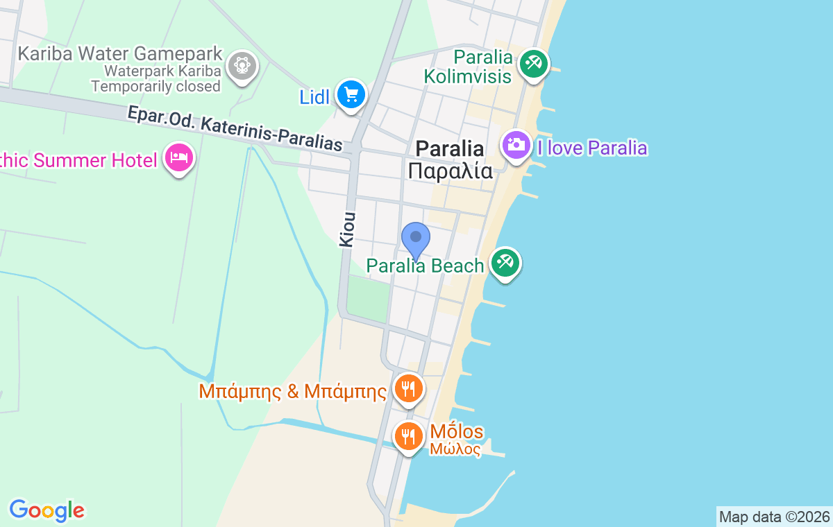 Kyma Studios este situat în inima pitorescului stațiune Paralia, la doar 200 m de plaja cu nisip. Acest loc de cazare reprezintă o alegere excelentă pentru cei care se bucură de ritmul dinamic al Paraliei, de bogăția sa și de energia locului plin de turiști, unde o mulțime de cafenele și restaurante se întind la fiecare pas, oferind o varietate de opțiuni pentru orice gust. Kyma Studios oferă combinația ideală între apropierea de mare și atmosfera vibrantă, perfectă pentru o vacanță de neuitat în regiunea Olimpului.