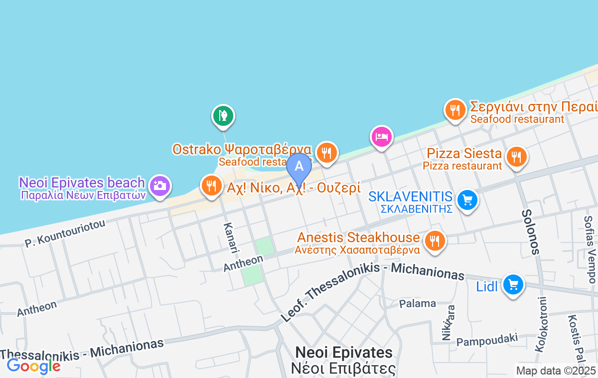 Apartamentul Soli este situat în localitatea Nea Epivates, la doar 70 de metri de plajă și la aproximativ 15 kilometri de popularul parc acvatic Waterland. În apropierea apartamentului se găsesc brutării, supermarketuri, taverne, cafenele și tot ce vă poate fi de folos în timpul șederii. Locul este liniștit și plăcut, iar datorită apropierea de Salonic și aeroport, este ideal pentru o scurtă vacanță sau pentru o vacanță în familie. Conexiunea cu orașul și facilitățile din zonă fac această cazare o alegere excelentă pentru turiștii care doresc să combine relaxarea cu vizitarea.