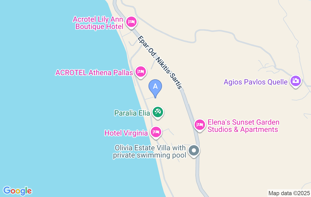 Găsirea cazării este ușoară. Conducând pe drumul principal Nikiti - Sarti, la 120m după ce veți vedea de partea dreaptă hotelul Lily Ann Beach, faceți la dreapta și conduceți aproximativ 400m, până când ajungeți la Elia Apartments Sithonia.