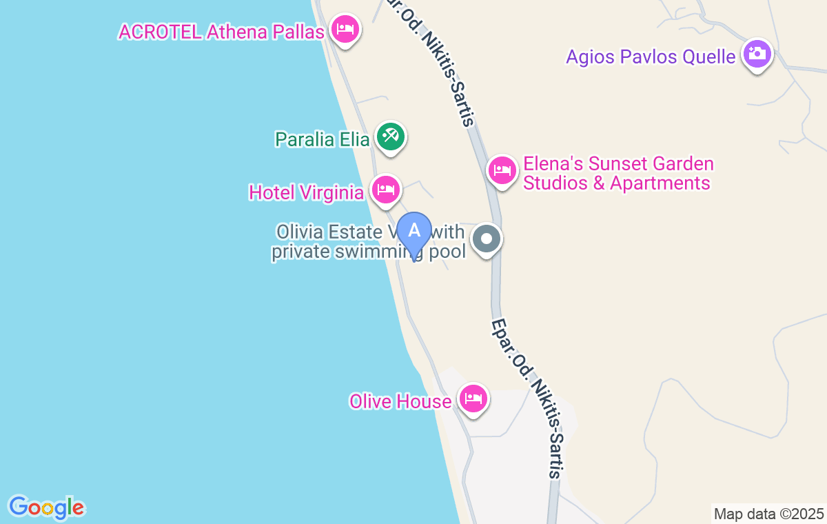Pergiali House este o locație de cazare în cadrul unui complex privat, situat pe plaja Elia. Este compusă dintr-o singură unitate de cazare, astfel oferind liniște și intimitate. Este într-o stare excelentă, în stil tradițional, unde predomină combinația de lemn și piatră, iar camerele sunt amenajate cu gust, proaspete și plăcute.