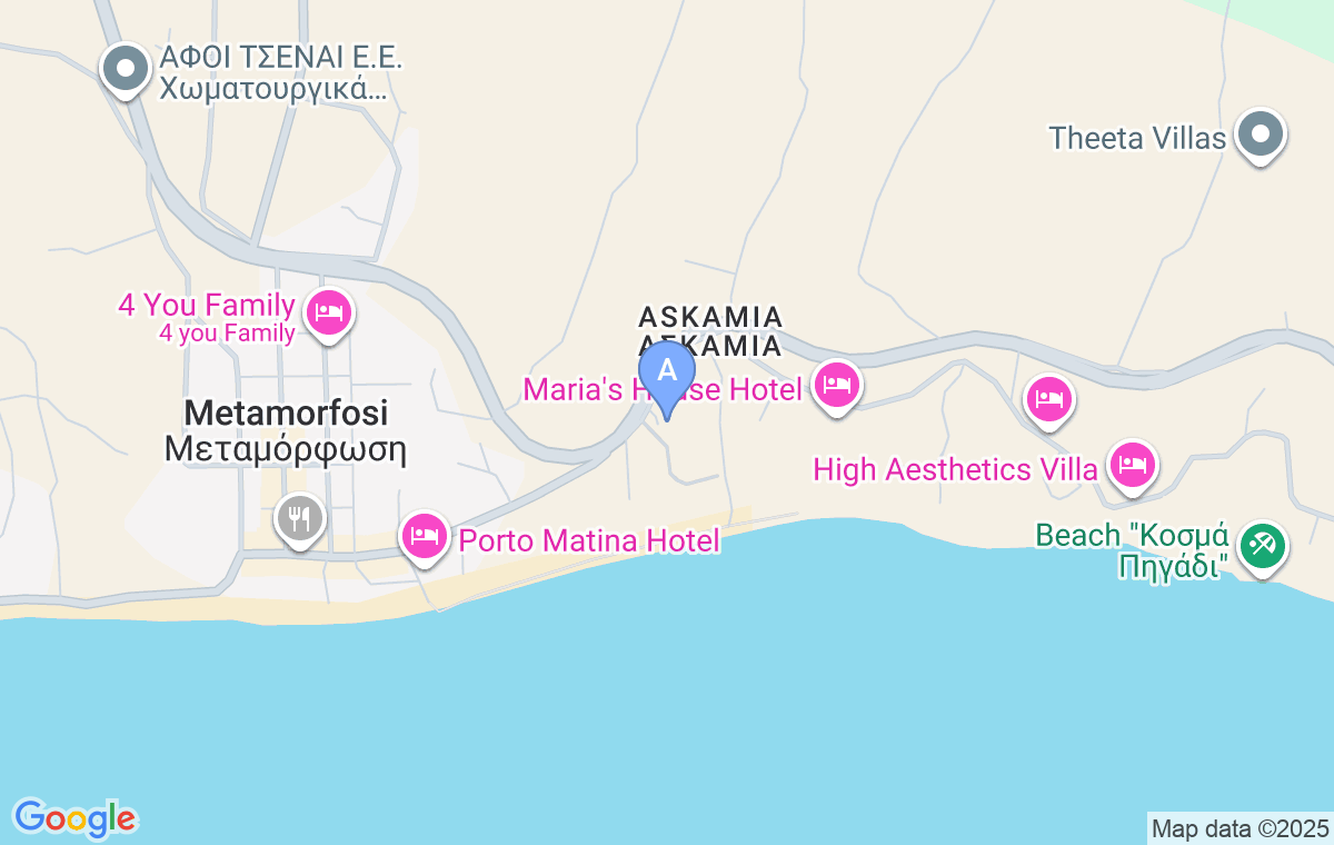Vila Askamnia și Suitele, situate în apropierea Metamorfosijei, sunt locuri de cazare create pentru relaxare, cu o curte frumoasă și unități de cazare confortabile și curate. Poziționarea este excelentă, fiind în afara agitației, însă Metamorfosiji se poate ajunge pe jos, iar centrul Nikitului este la doar cinci minute cu mașina. Vila dispune de studiouri pentru 2-4 persoane și apartamente pentru maxim cinci persoane, iar în apropiere se află unele dintre cele mai frumoase plaje din Sithonia. În curtea sigură și frumos amenajată există piscine private pentru unele dintre studiouri sau apartamente, precum și parcare privată, iar oaspeților li se oferă posibilitatea de a servi micul dejun contra cost.