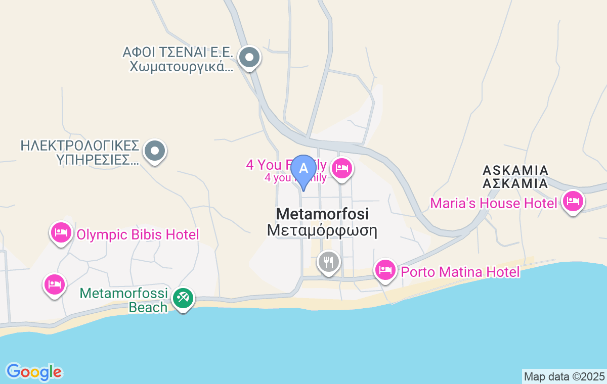 Cazarea se află la aproximativ 400m de plajă, fiind înconjurați de un parc ideal pentru plimbări plăcute printre amestecul de arome ale coniferelor și mării. În jurul parcului se găsește centrul de activități din Metamorfosi, cu terenuri de joacă pentru copii, câteva magazine turistice, taverne, pizzerii, cafenele și restaurante fast-food. Cel mai apropiat supermarket, cofetărie și brutărie se află la aproximativ 200-250m distanță.