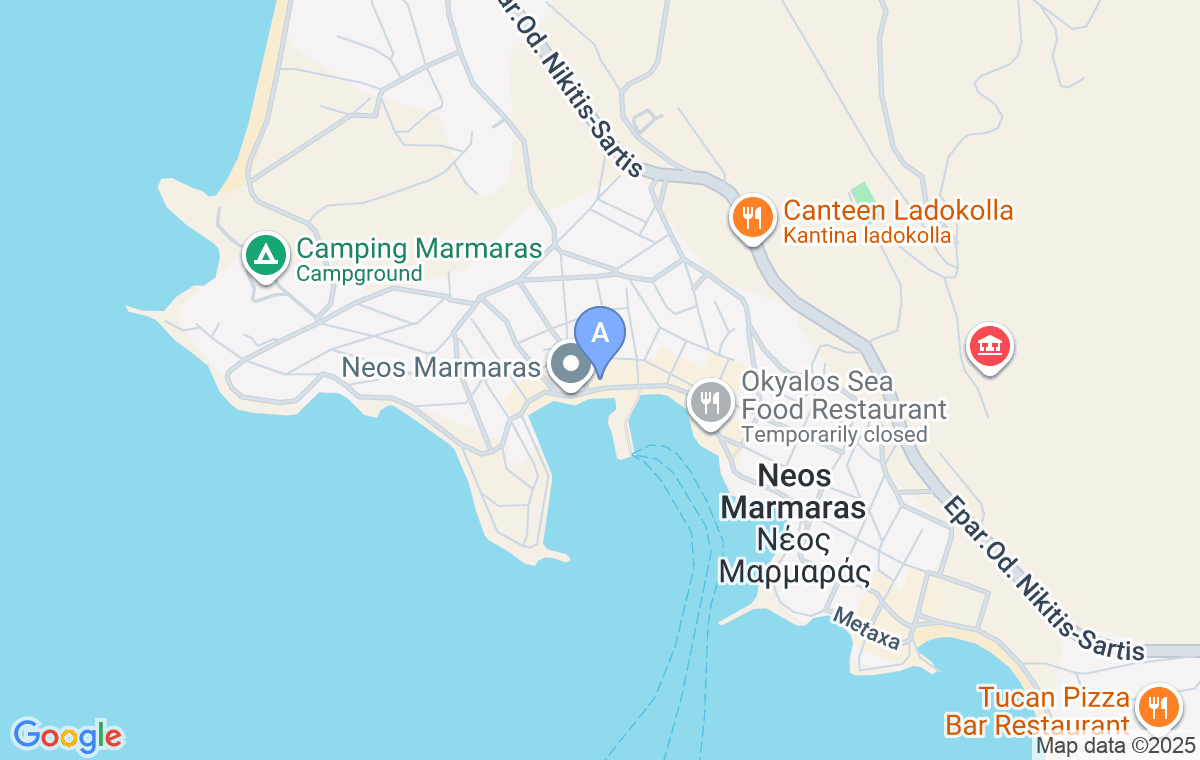 Hotelul se află chiar lângă poștă, dacă virați la prima intrare dinspre Nikiti, iar apoi coborâți spre port.