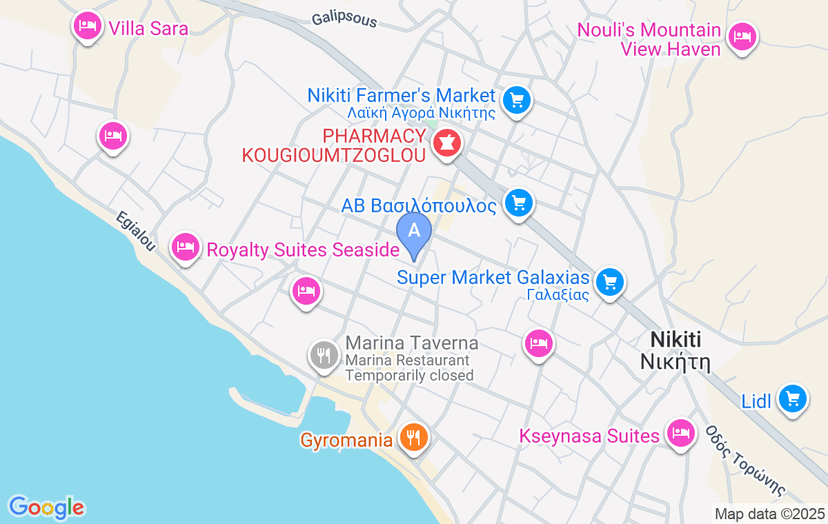 Cazarea este ușor de găsit venind dinspre Salonic, când vă întoarceți la semafor din drumul principal către Nikiti, coborâți spre plajă pentru următorii 400m și veți observa cazarea la dreapta.