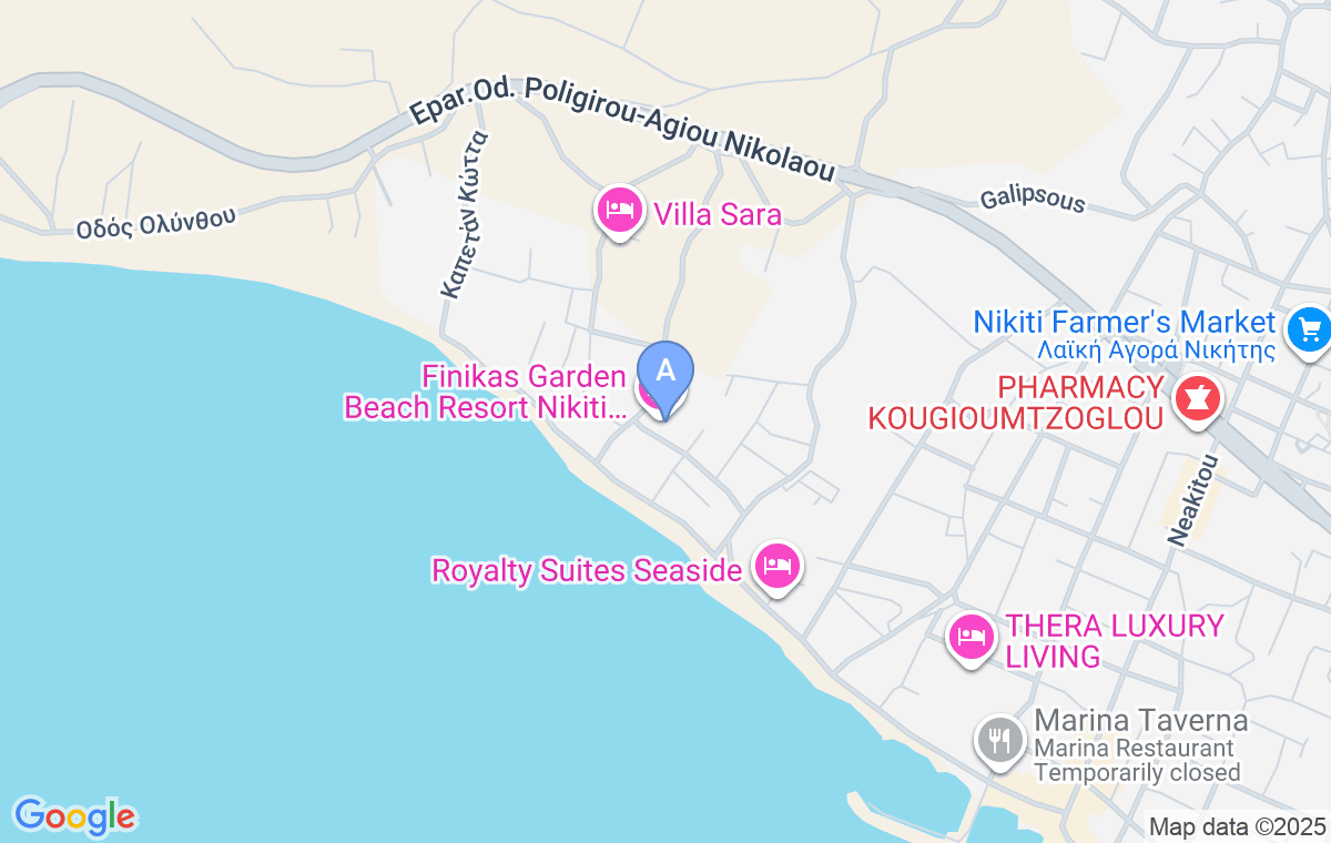 Finikas Garden este un complex nou complet, construit într-o zonă liniștită și mai puțin populată din Nikiti, la doar 100m de mare. Unitățile de cazare sunt întreținute cu grijă și sunt mobilate modern și cu bun gust, având un design contemporan. Facilitățile includ o curte mare și frumos amenajată, plină de verdeață, parcare privată, piscină deschisă pentru adulți și o piscină pentru copii, precum și un loc de joacă pentru copii, situat imediat lângă complex.