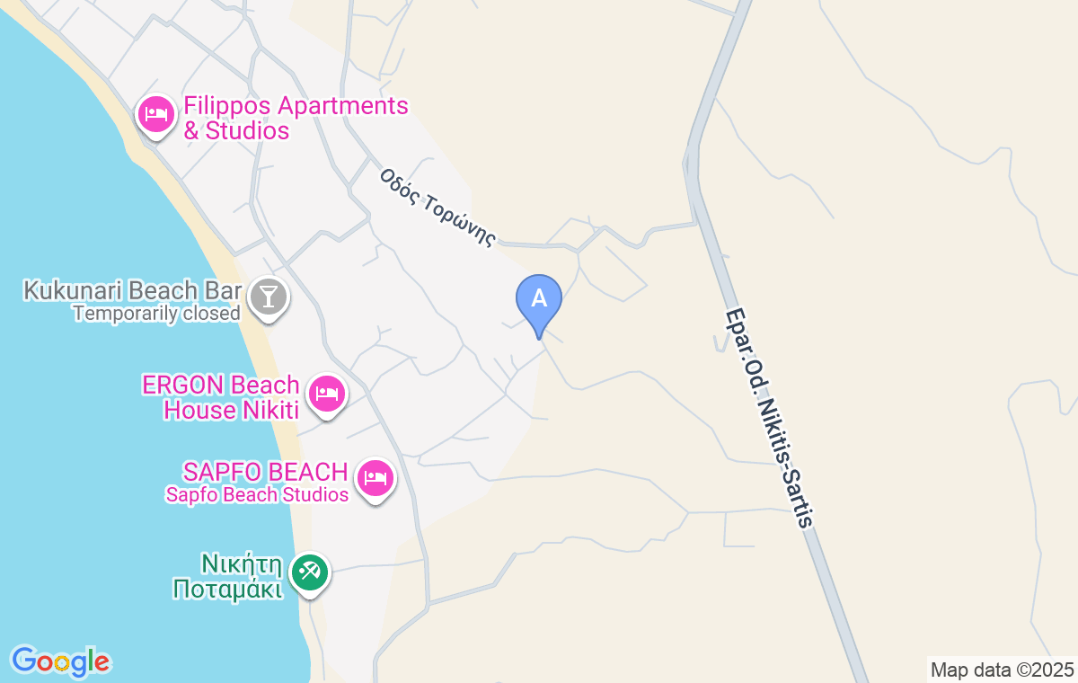 Este situat la 550 m de plajă, la aproximativ 1,5 km de cea mai apropiată mare magazin pe drumul principal și tot la 1,5 km de centrul Nikiti, cu baruri, magazine și taverne.