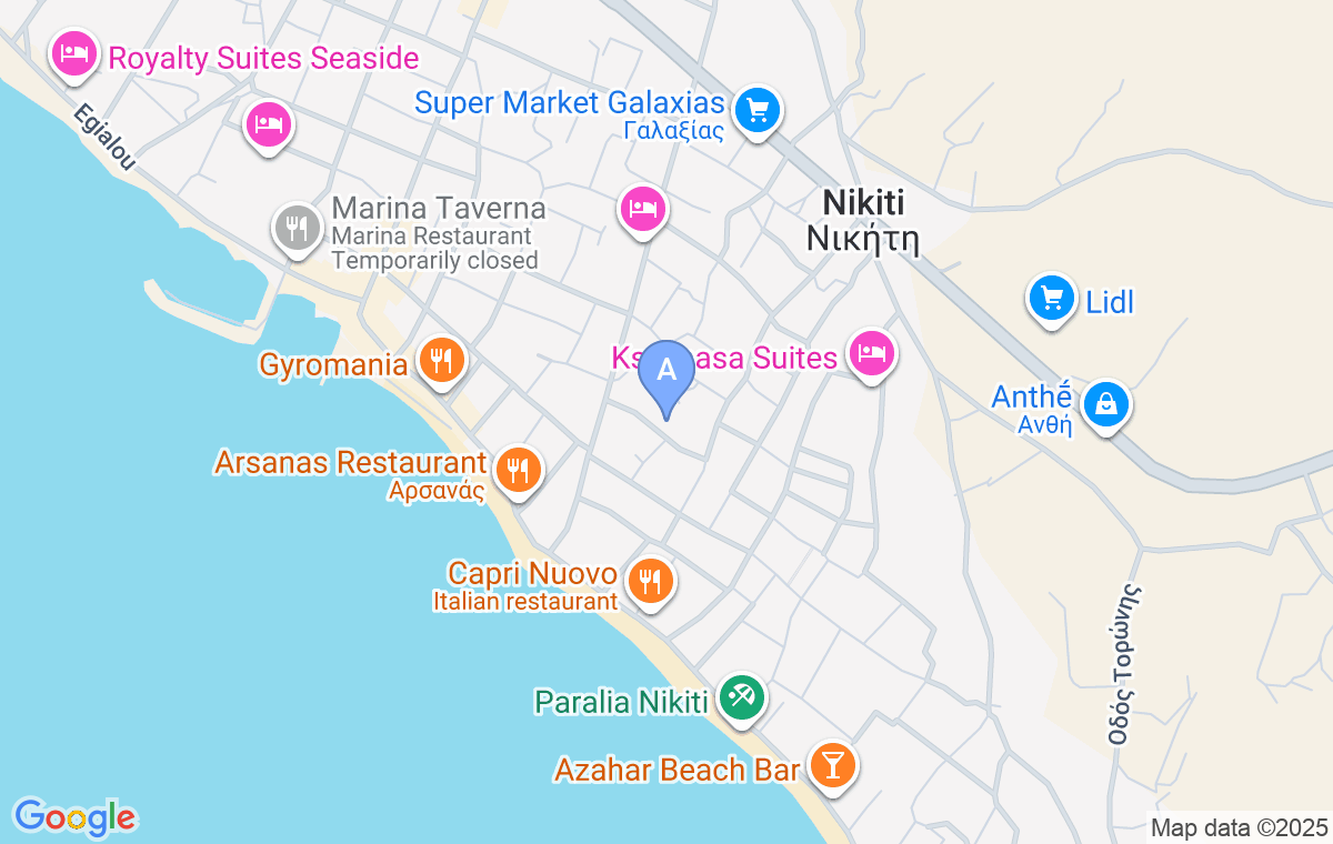Plaja orașului se află la aproximativ 300 de metri distanță, brutăria Zorbas și măcelăria sunt la aproximativ 140 de metri, iar supermarketul Masoutis se află sub drumul principal, la aproximativ 500 de metri.